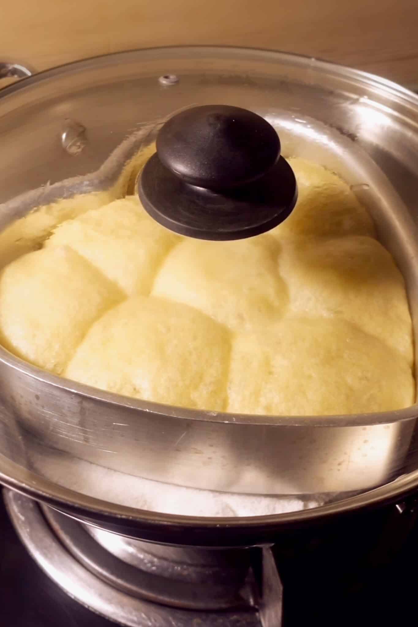 These dinner rolls (pav) are made entirely on the stovetop, using a kadhai with a layer of salt at the bottom to create a makeshift oven. The salt acts as a buffer, helping distribute heat evenly so the bread bakes without direct contact with the flame. We do 2 rounds of proofing: a bulk proof to let the dough rise and develop flavour and then a shorter proof after shaping the dough into balls and arranging them in the tin. Since there’s no heat source from the top, the pav won’t develop a deep golden crust on the surface but the sides and bottom turn beautifully golden and crisp while the inside stays soft and fluffy: exactly what you want from fresh, homemade pav!