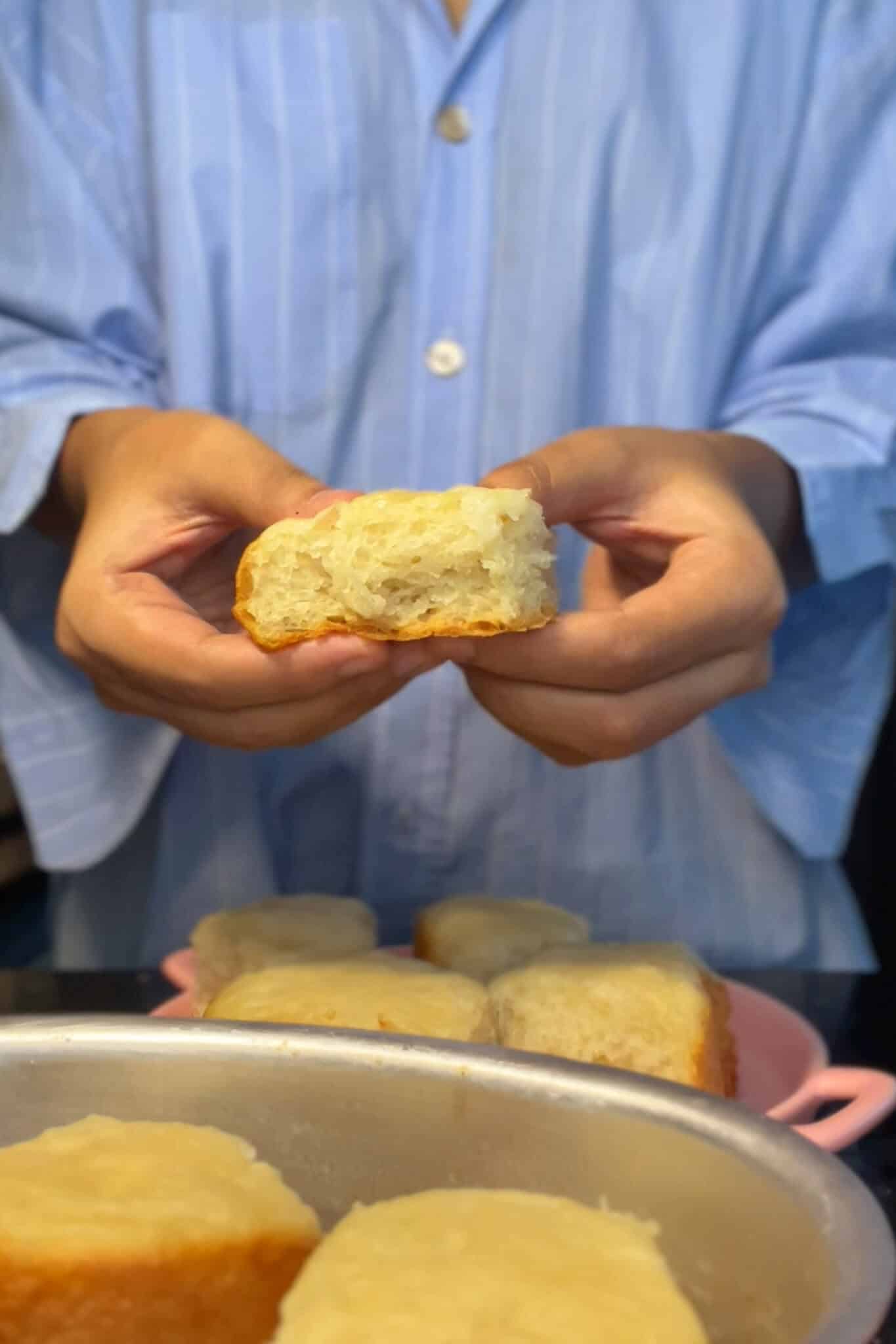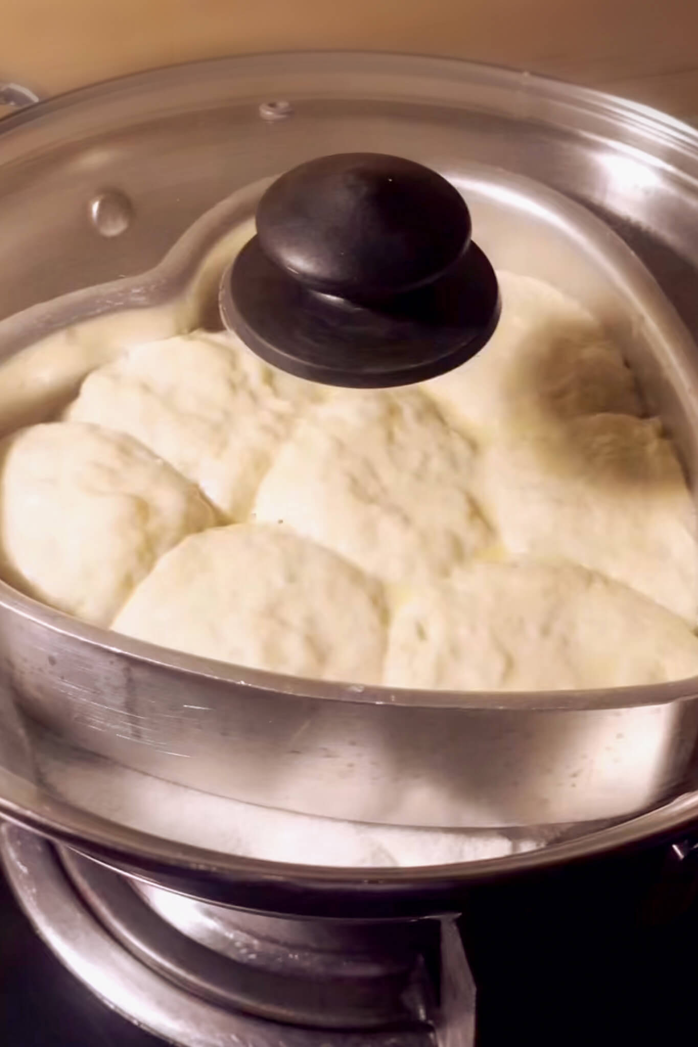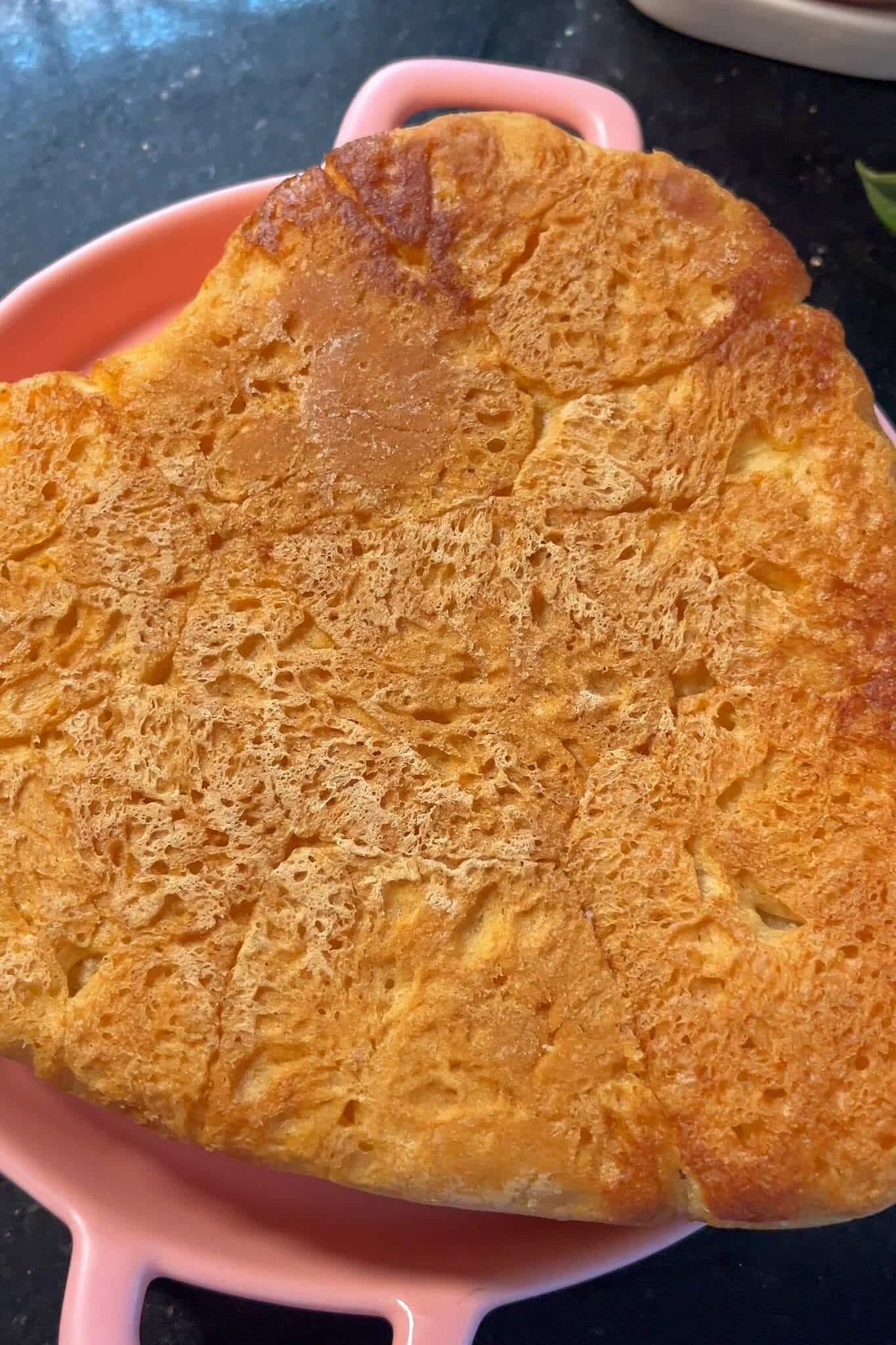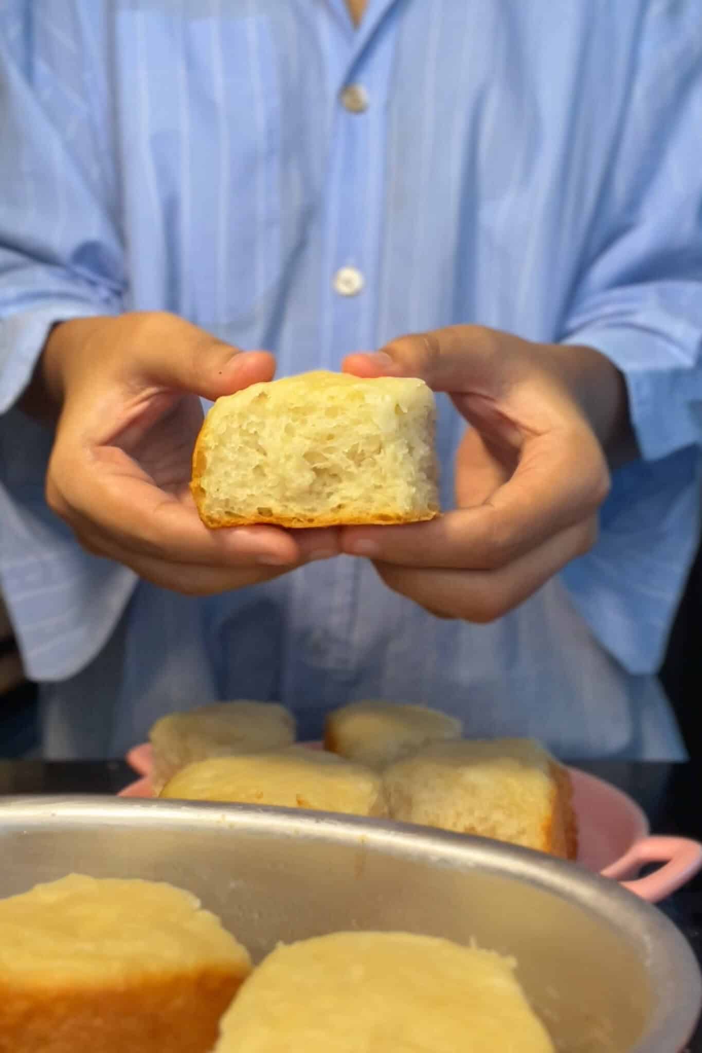 These dinner rolls (pav) are made entirely on the stovetop, using a kadhai with a layer of salt at the bottom to create a makeshift oven. The salt acts as a buffer, helping distribute heat evenly so the bread bakes without direct contact with the flame. We do 2 rounds of proofing: a bulk proof to let the dough rise and develop flavour and then a shorter proof after shaping the dough into balls and arranging them in the tin. Since there’s no heat source from the top, the pav won’t develop a deep golden crust on the surface but the sides and bottom turn beautifully golden and crisp while the inside stays soft and fluffy: exactly what you want from fresh, homemade pav!