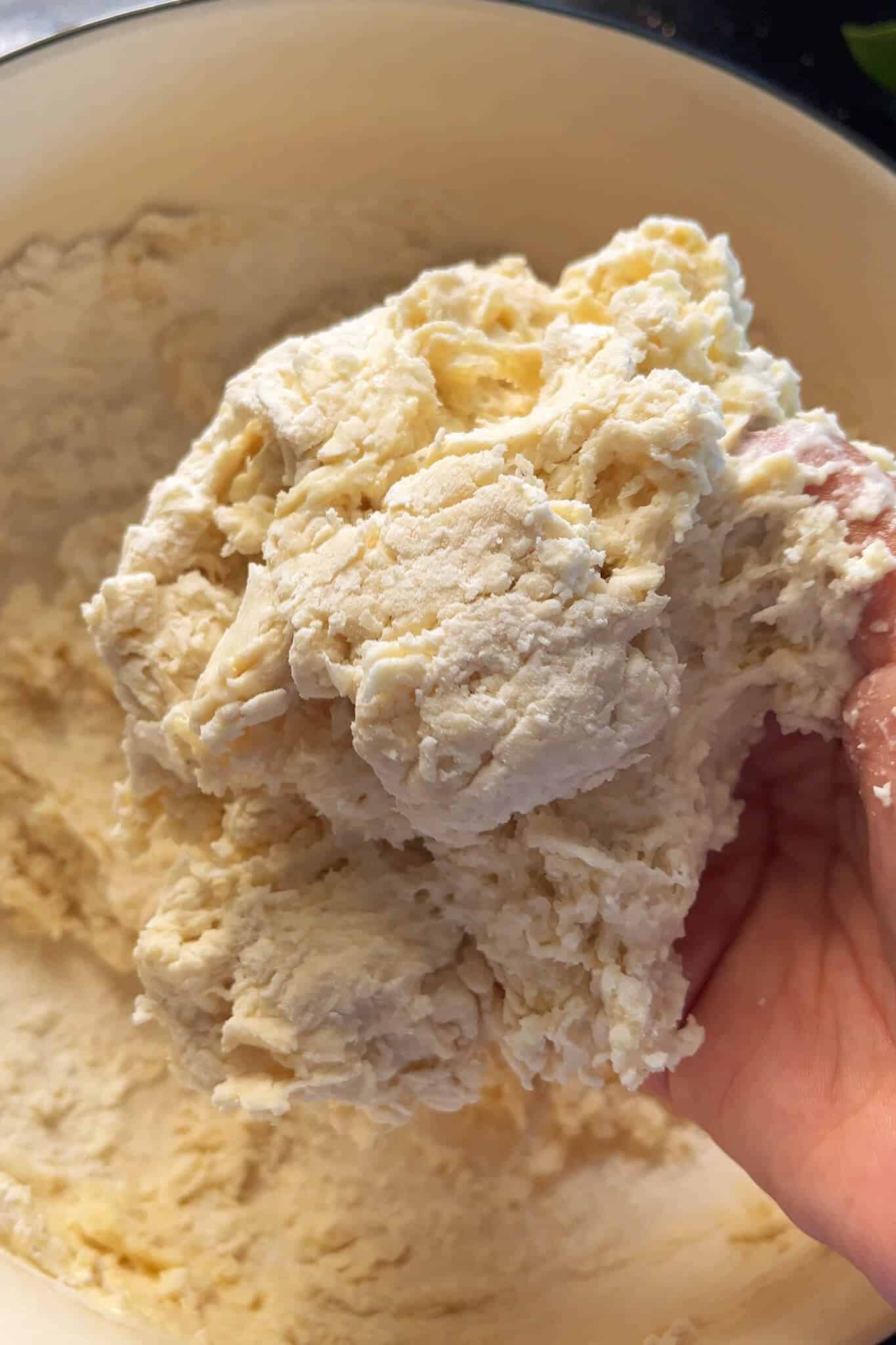 - In a big bowl, combine all purpose flour and salt, add the activated yeast mixture and mix with your fingers or chopsticks into a shaggy dough.