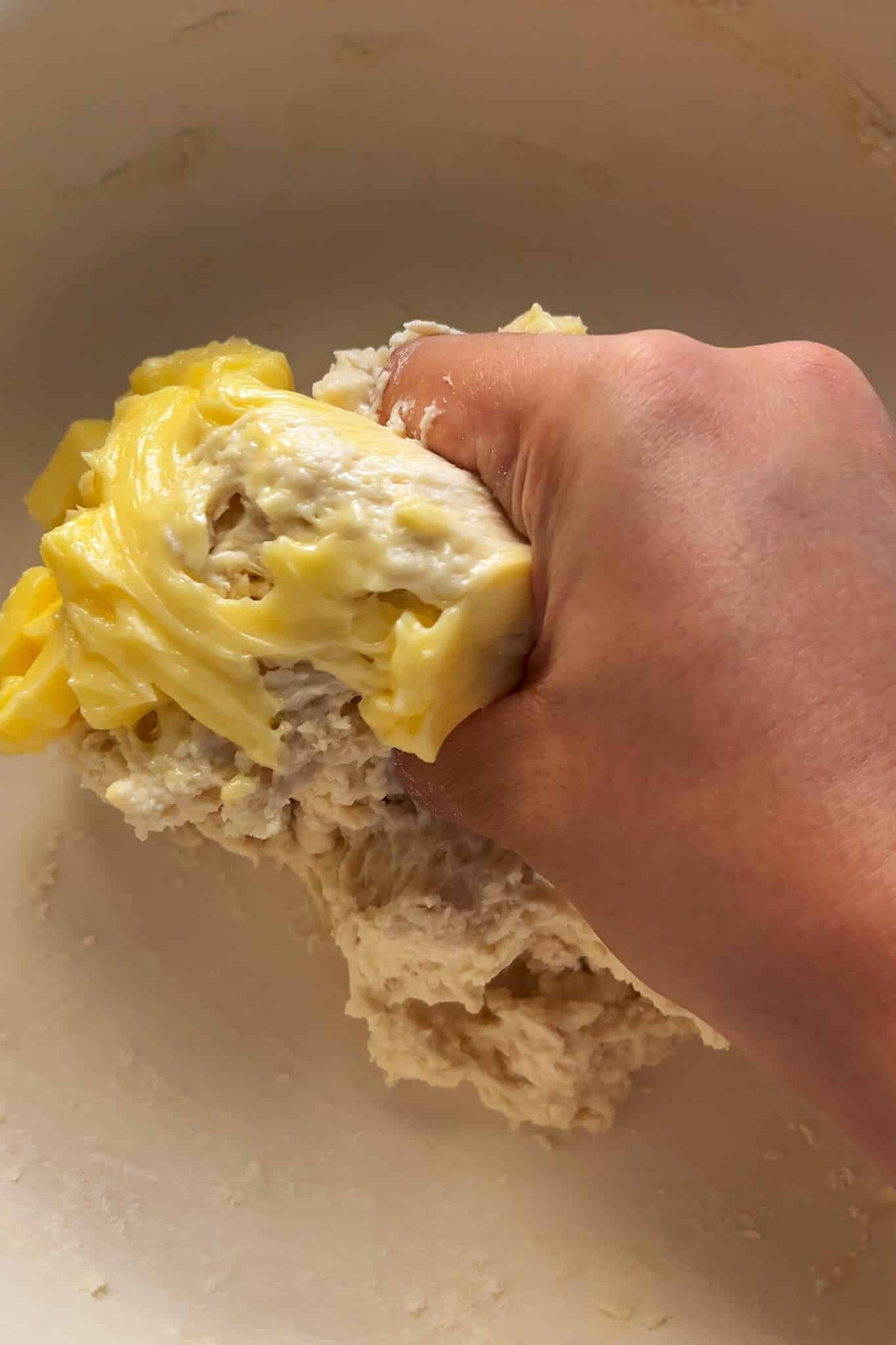 - Add butter to the dough and knead for around 10 minutes till the dough is soft, smooth and elastic. Feel free to add a tablespoon or two of additional flour if you find it hard working with the dough.