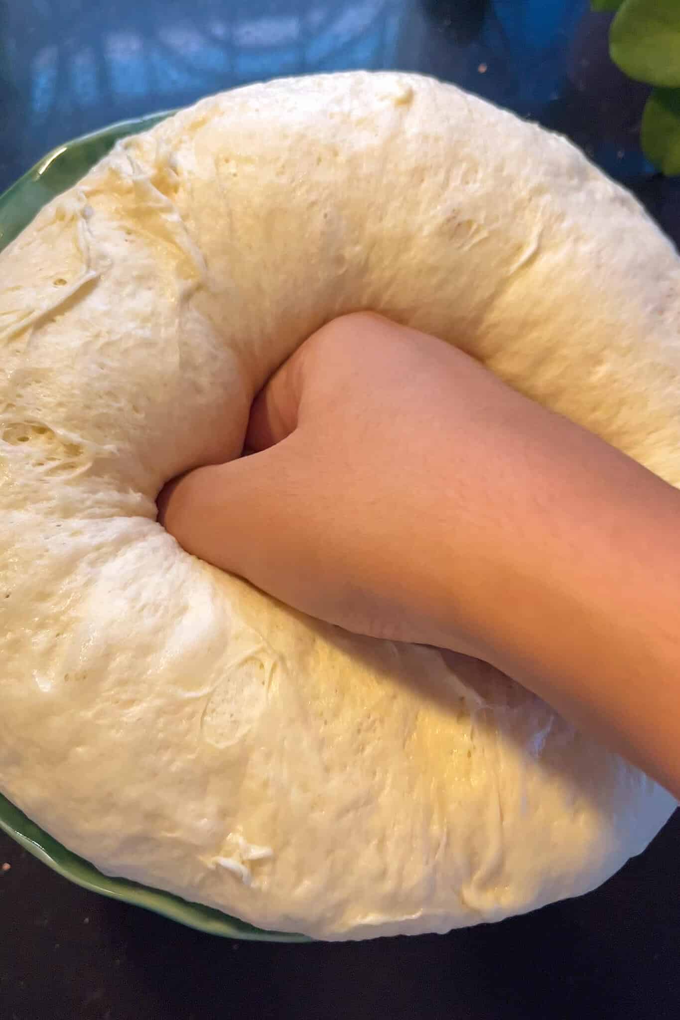 - Once doubled, punch down the dough and transfer it to a clean surface lightly dusted with flour.