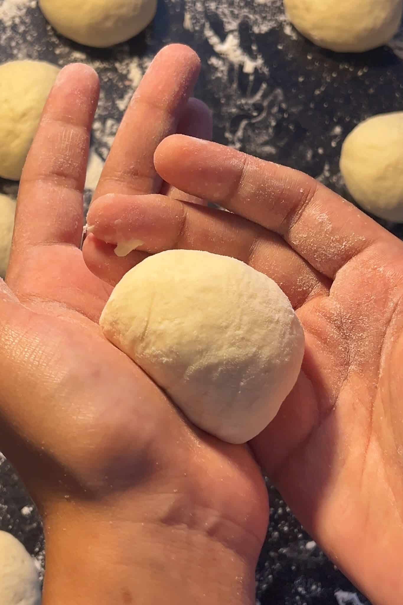- Divide the dough into 8 equal portions of dough (50 g each). To shape, hold a portion in your hands, gently pinch the edges together towards the centre, then turn it over and use your palms to cup and smooth it into a round ball.