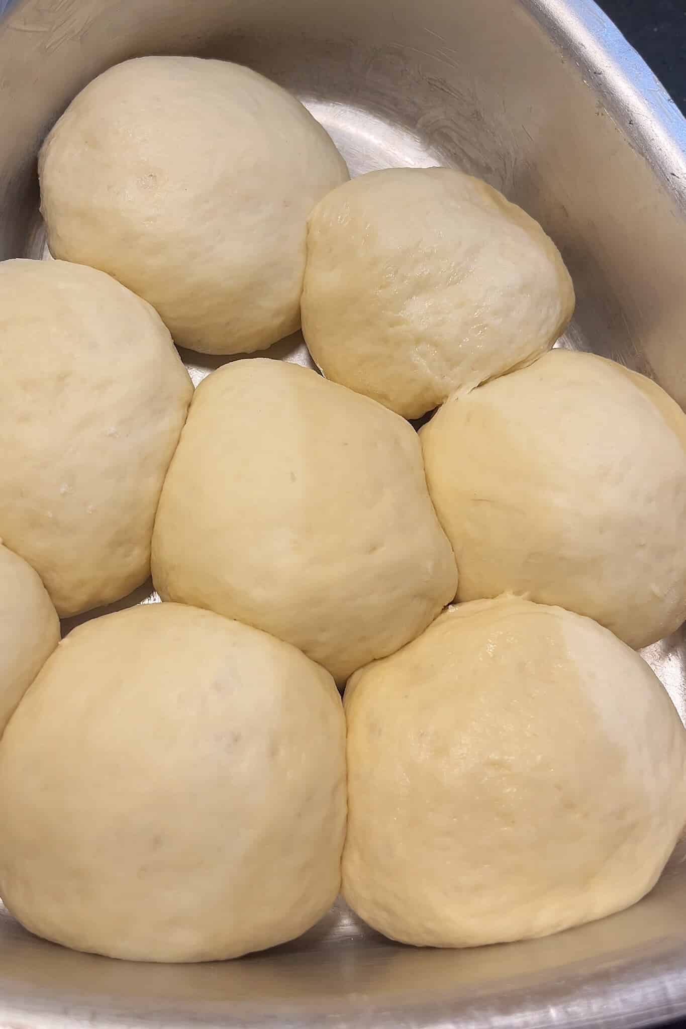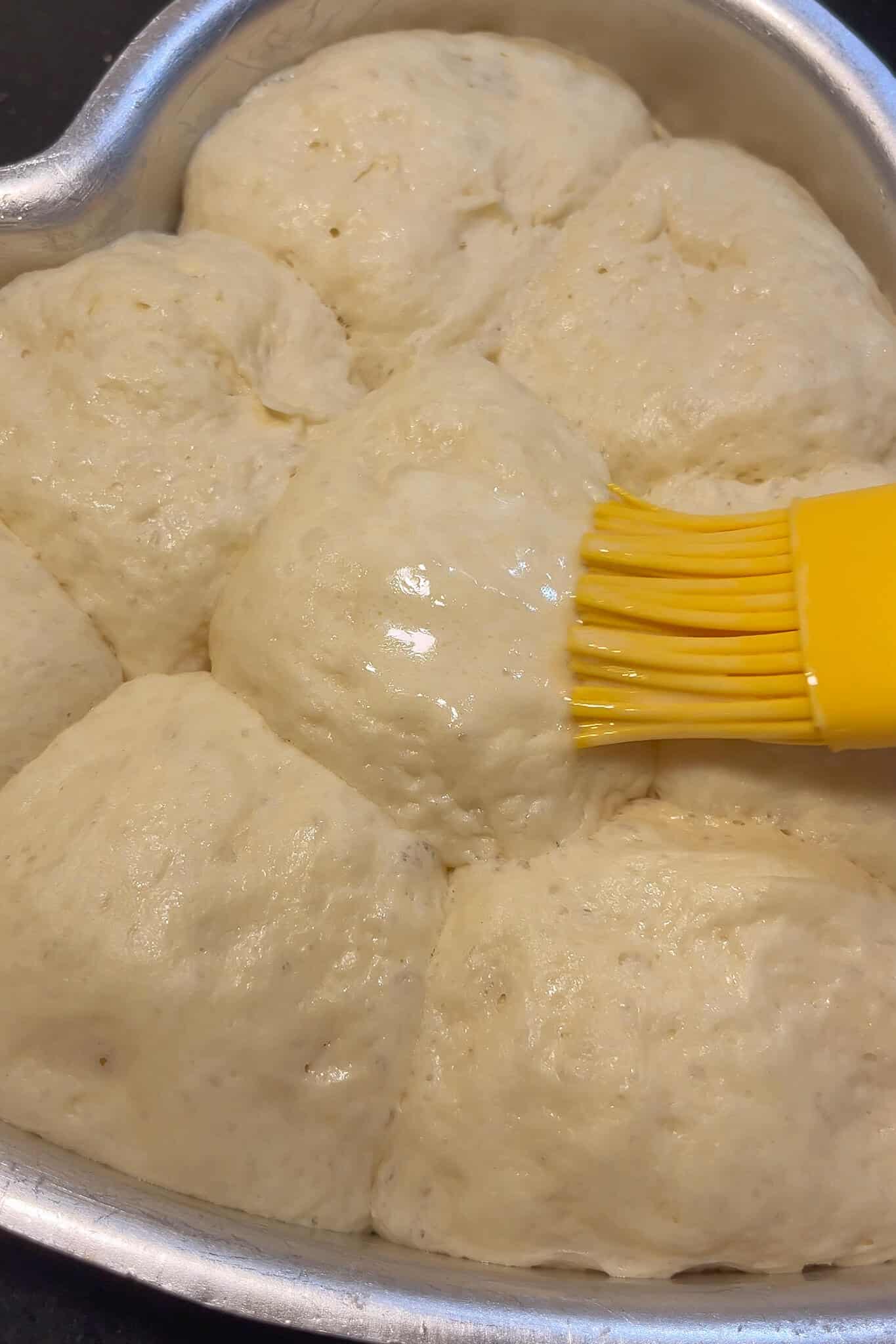- Place the dough balls in a greased tin, cover with a cling film and let it rise again for 30 minutes or till doubled in size.