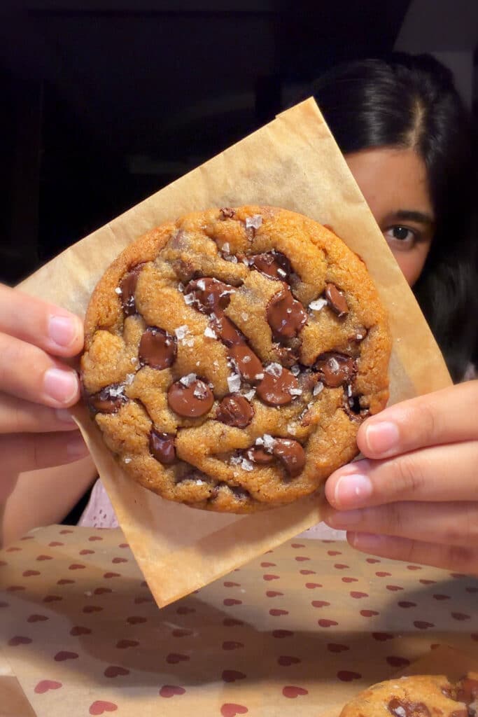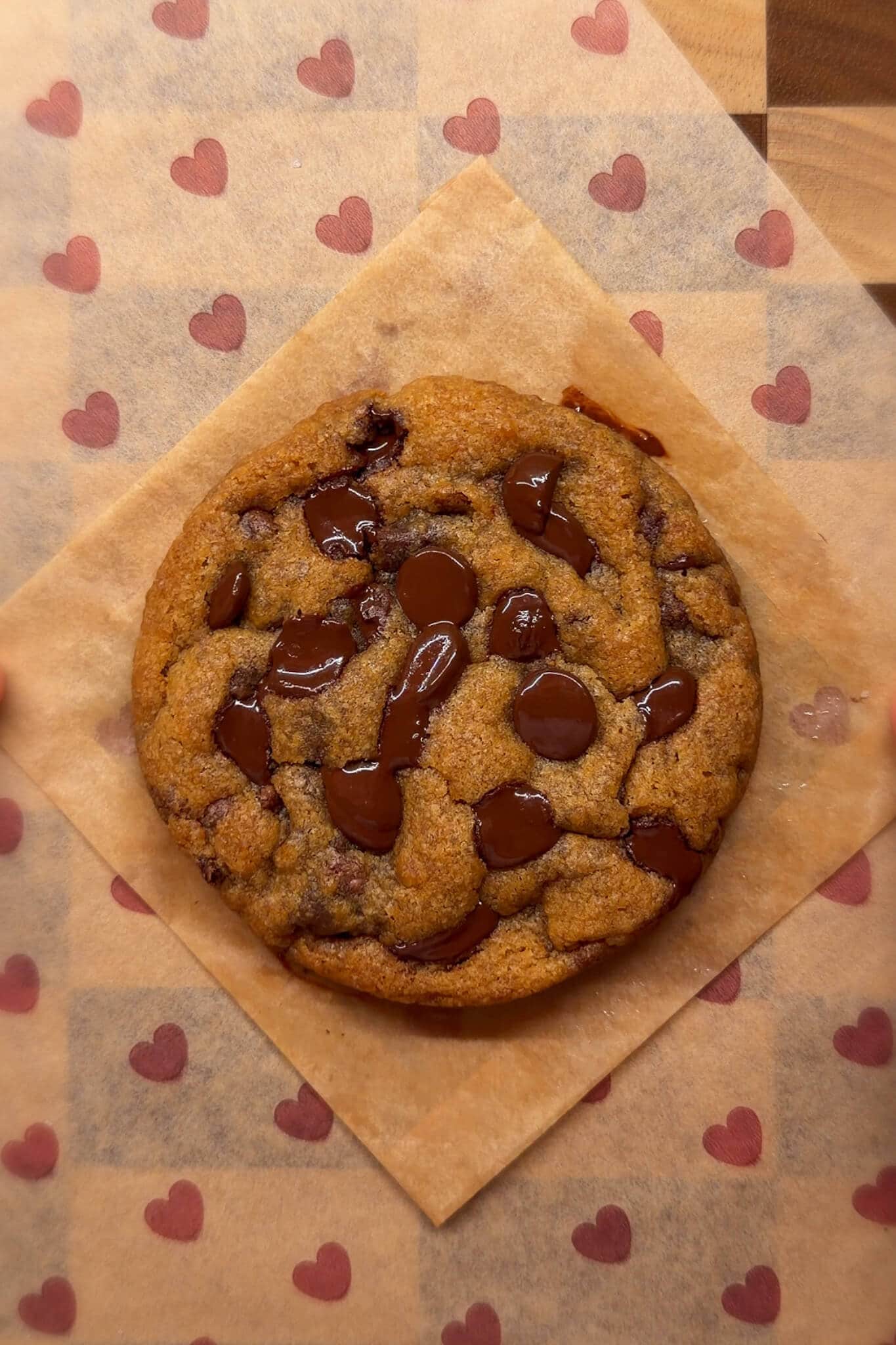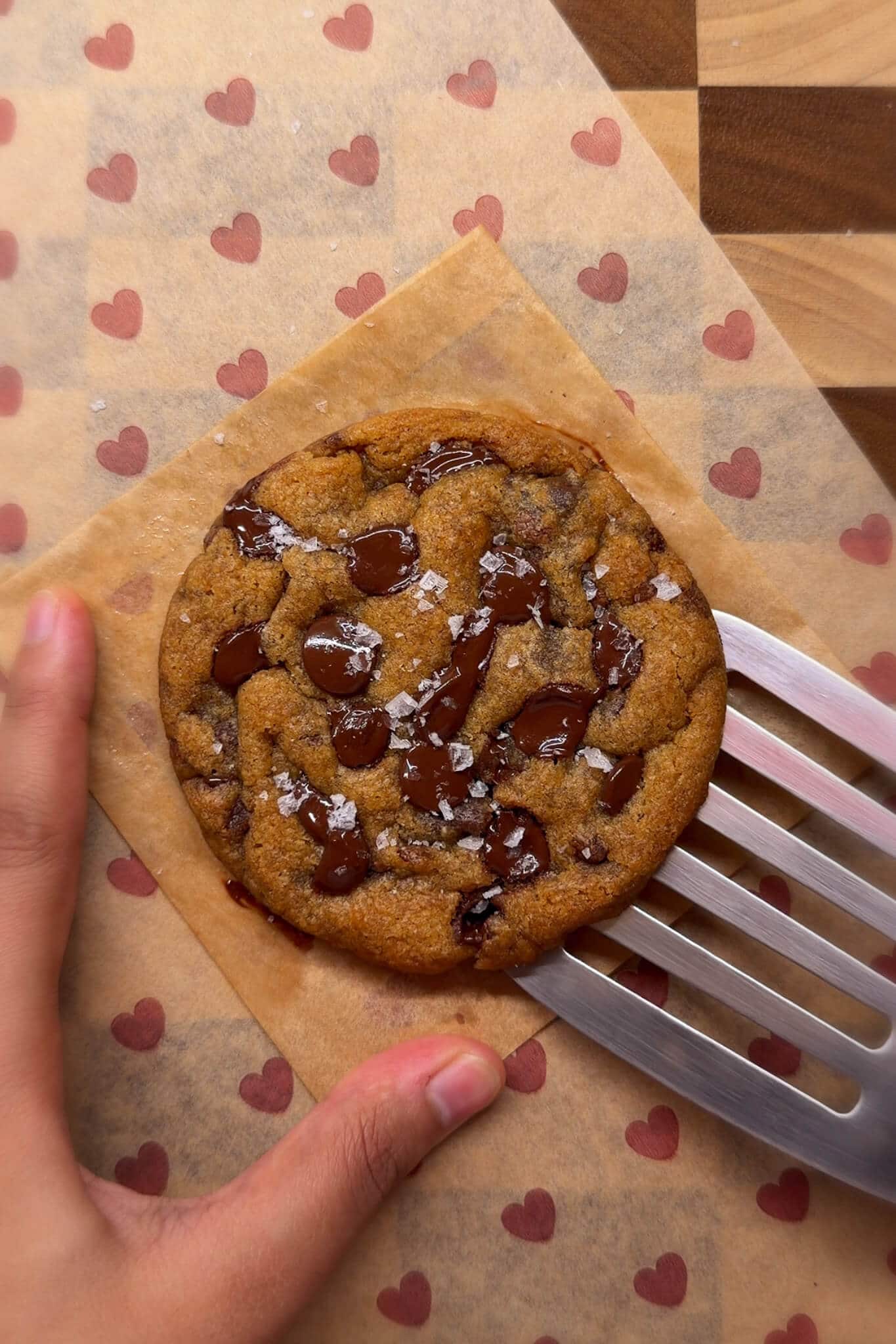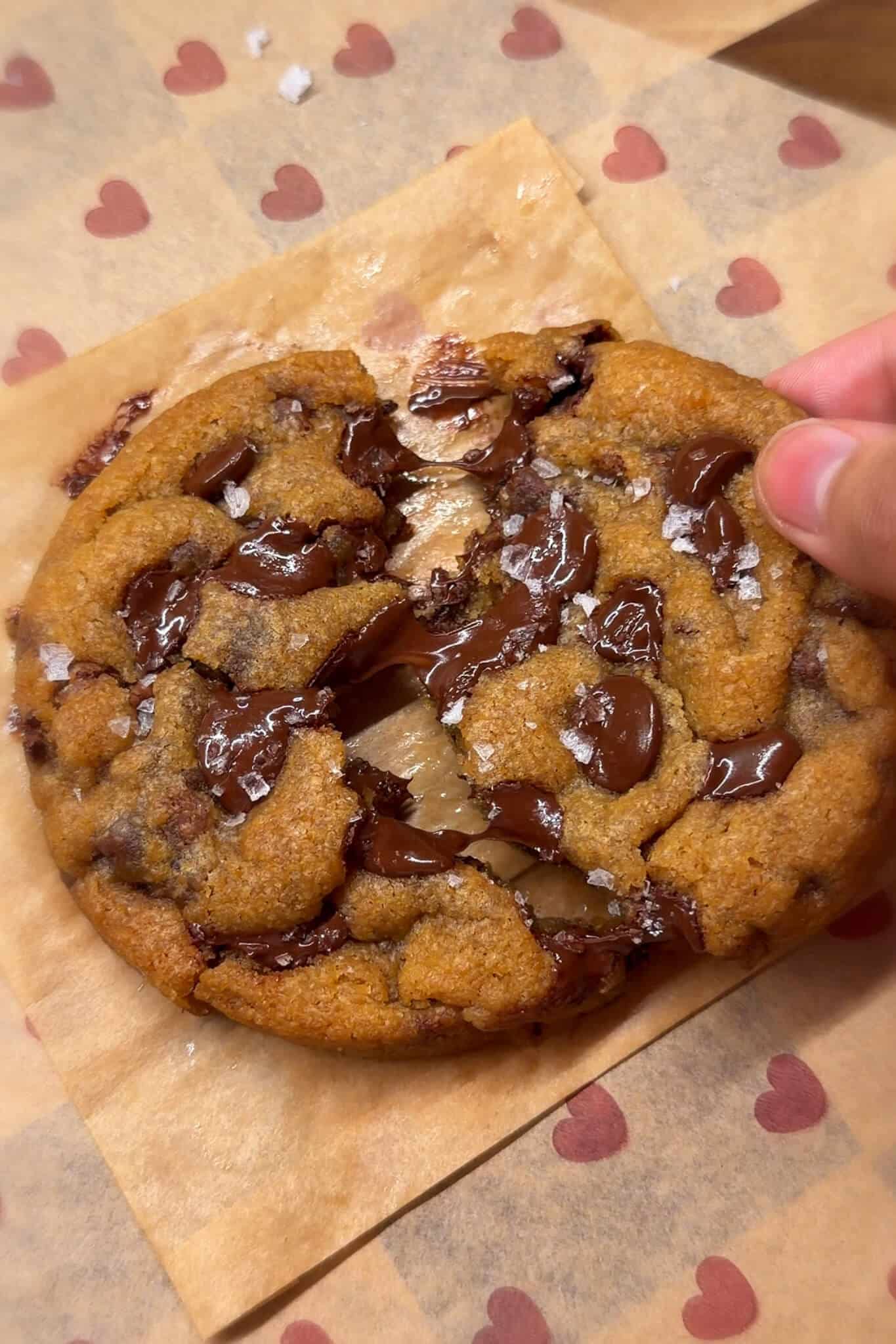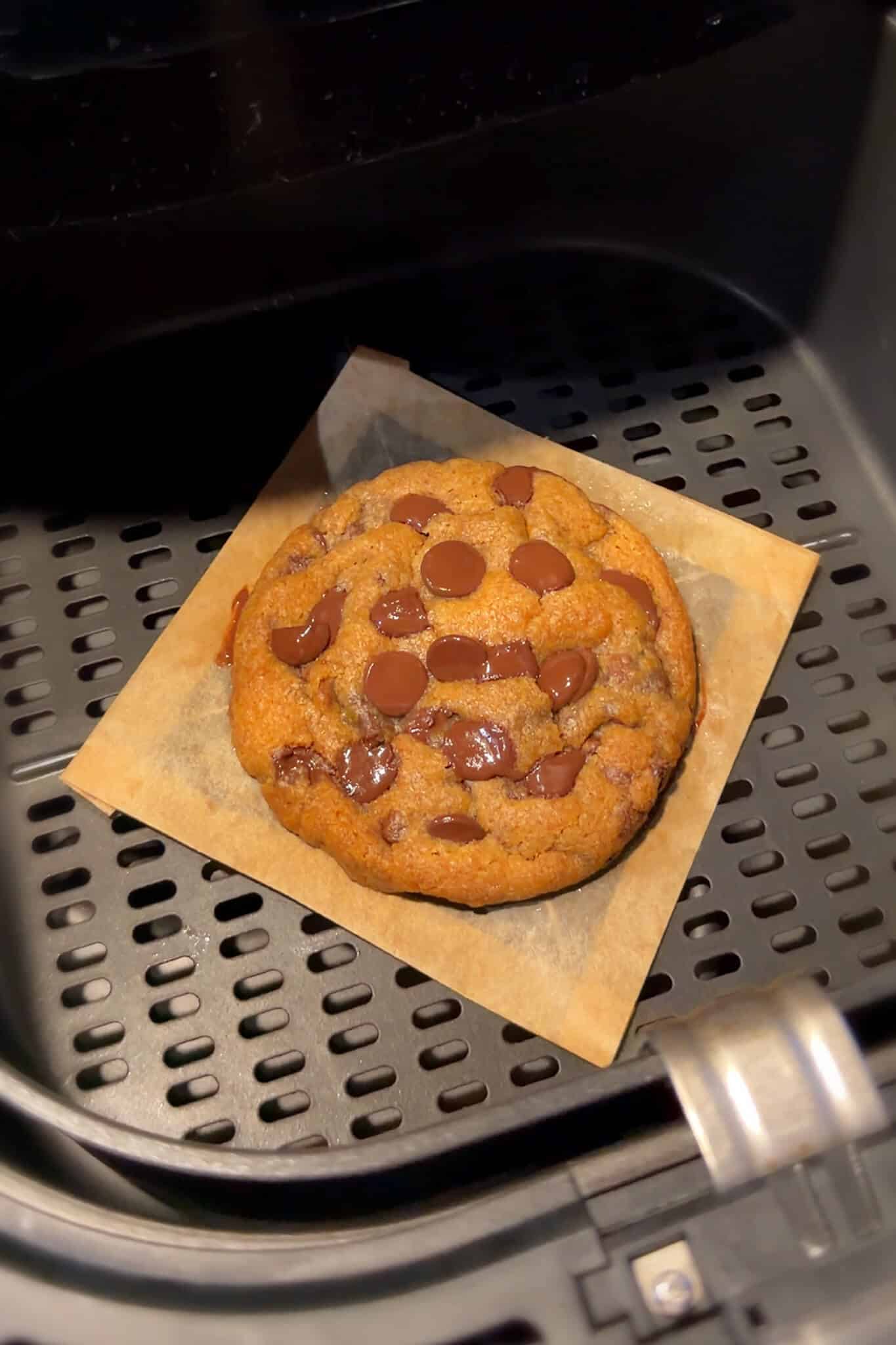 - Airfryer hack: Fold the corners and edges of your parchment paper slightly to weigh it down: this prevents it from flying up or gathering around the cookie, allowing your cookie to spread perfectly!