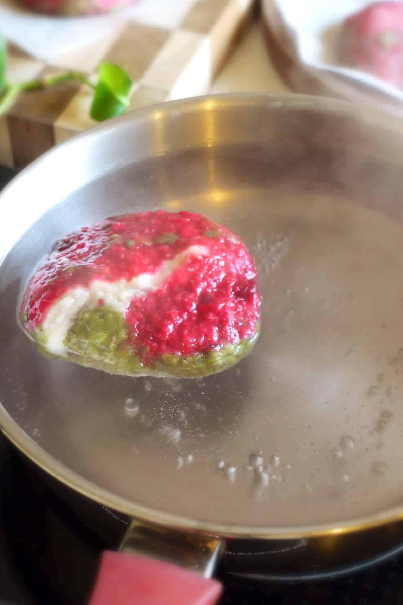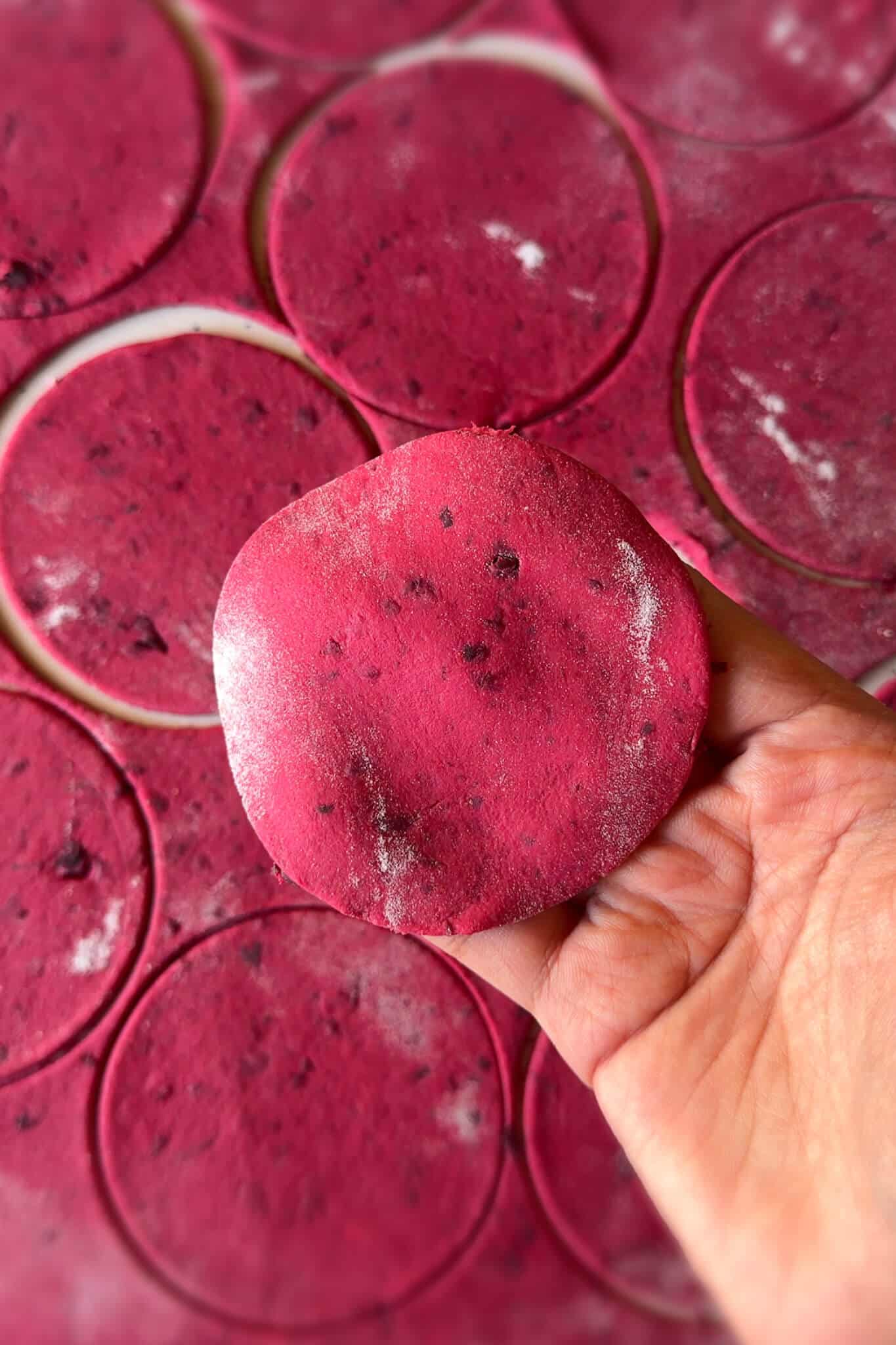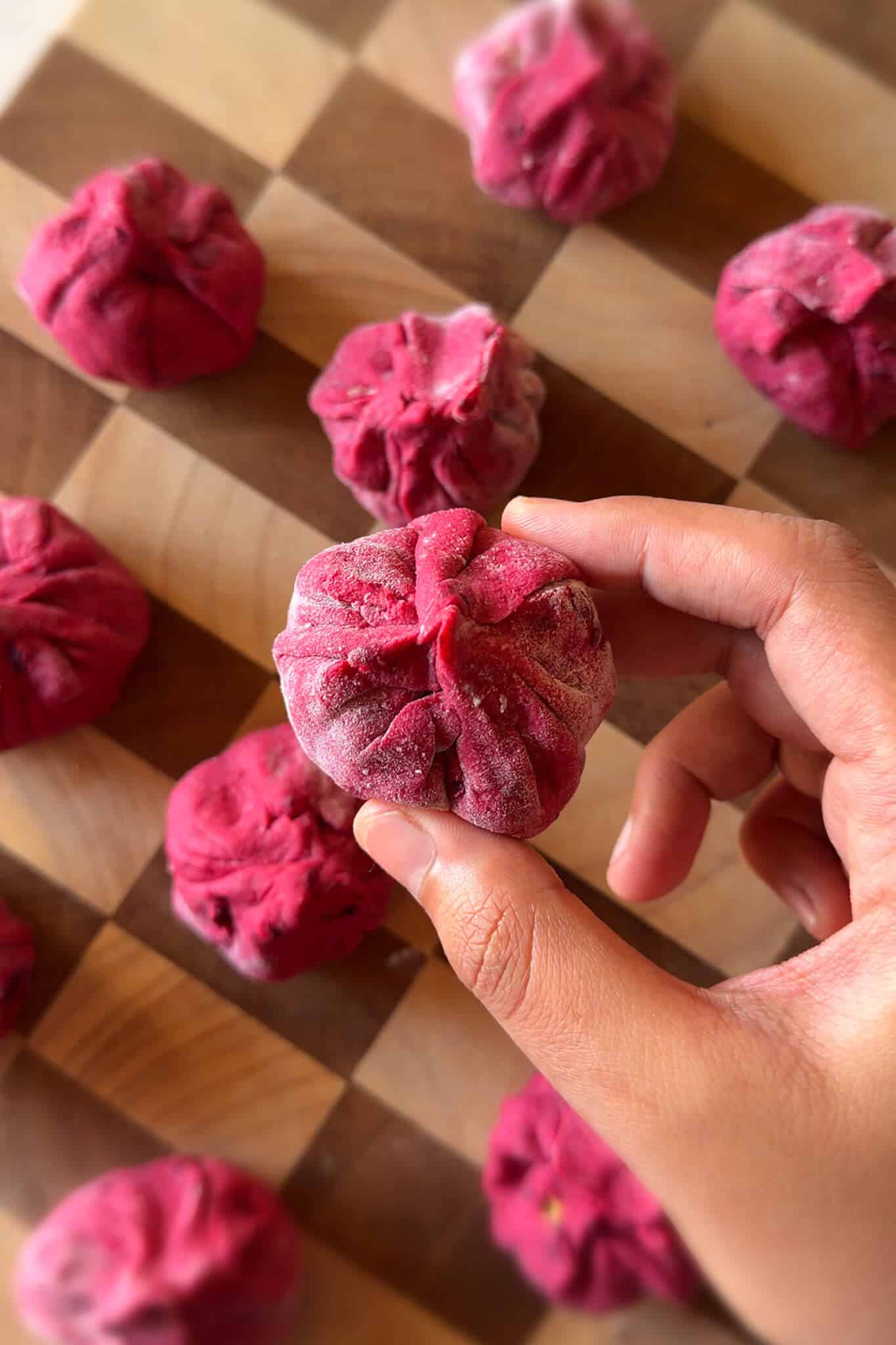 - Make the dough: In a mixing bowl, add whole wheat flour, salt and 1–2 tablespoons rice flour (this is optional but it adds a nice chew). Add grated roasted beet if using, this is purely for colour and can be skipped. Add oil, then start adding water little by little. Using a chopstick or fork, mix everything together until you get a shaggy dough. Once it starts coming together, knead with your hands for 3–4 minutes until smooth and soft. Cover and let the dough rest for 20 minutes while you prepare the filling.