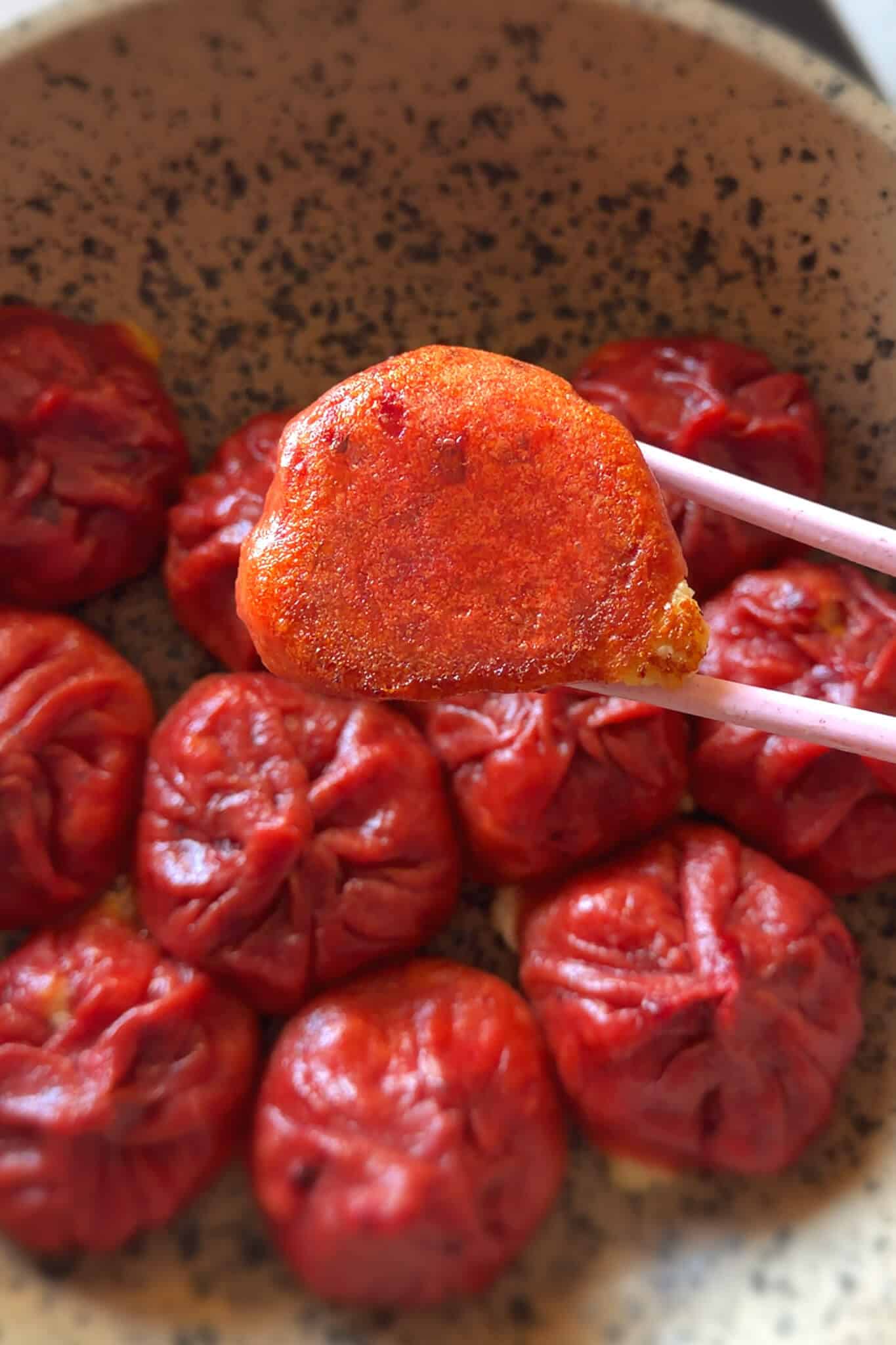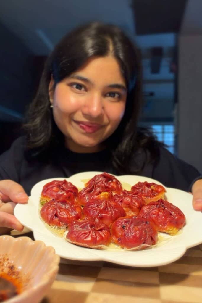 - Cook the momo: Heat a pan and add some oil. Place the dumplings in the pan with a little space between them and let them cook until the bottoms turn golden and crisp. Add a splash of water, cover the pan and let them steam until the wrappers are fully cooked and the filling is hot. Remove the lid and let any excess moisture evaporate.