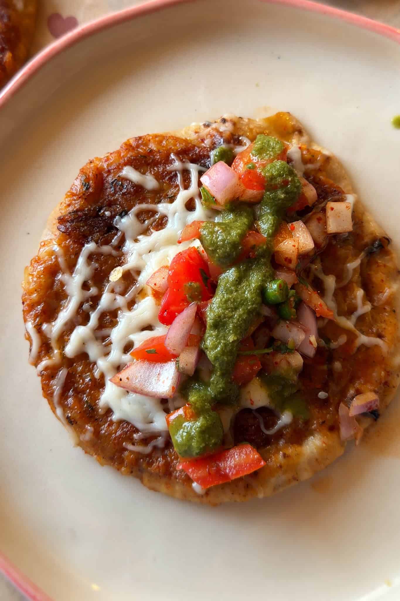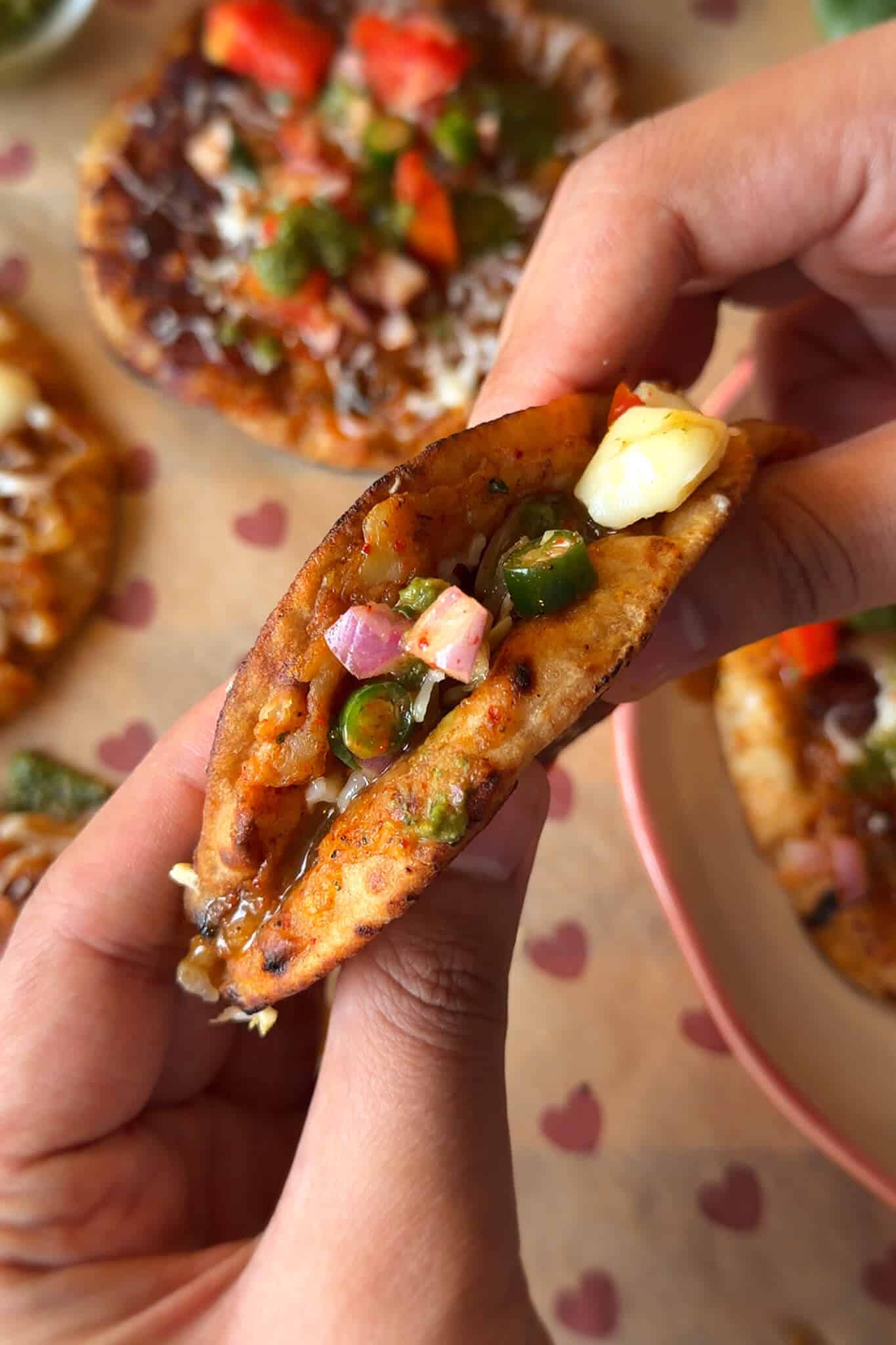 - Assemble and serve: Top the cheesy smashed taco with the tomato onion salad and some green chutney. Fold and serve hot.