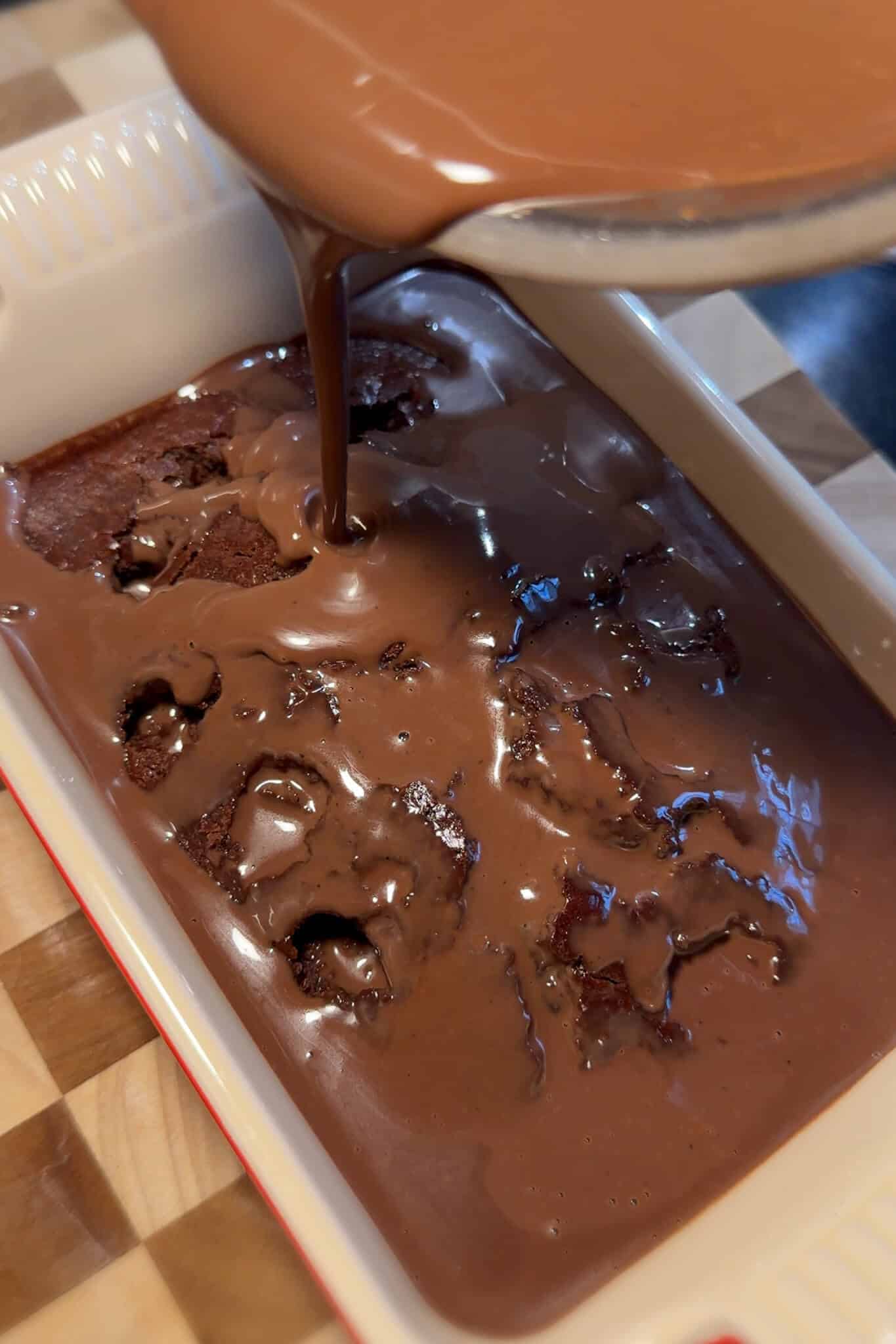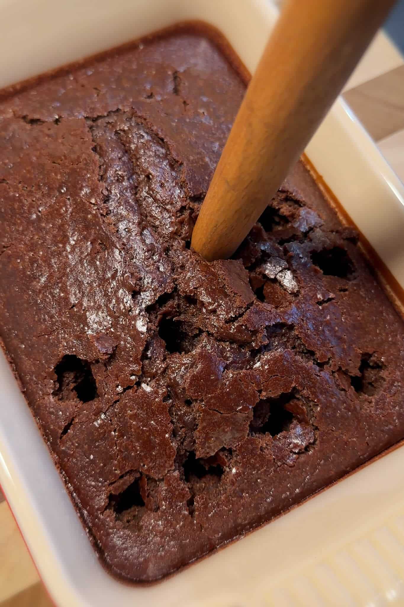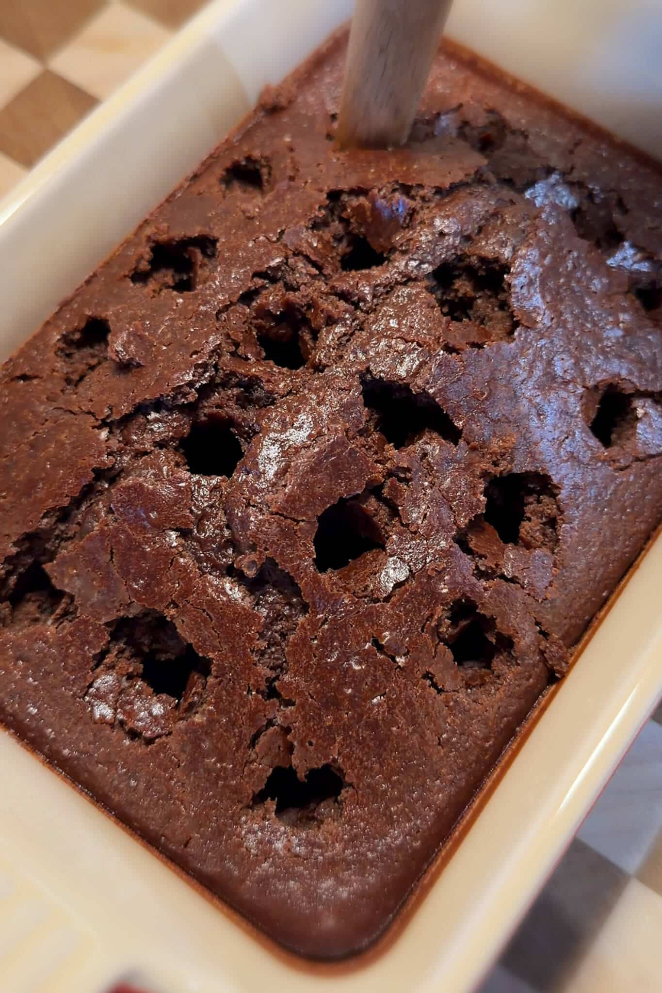 - Poke and soak: Using the back of a spatula or the handle of a wooden spoon, poke deep indents all over the cake. Slowly pour the warm hot chocolate over the cake, letting it sink into the holes naturally. Once all the hot chocolate is added, leave the cake to sit at room temperature for 10–20 minutes, allowing it to absorb everything properly.