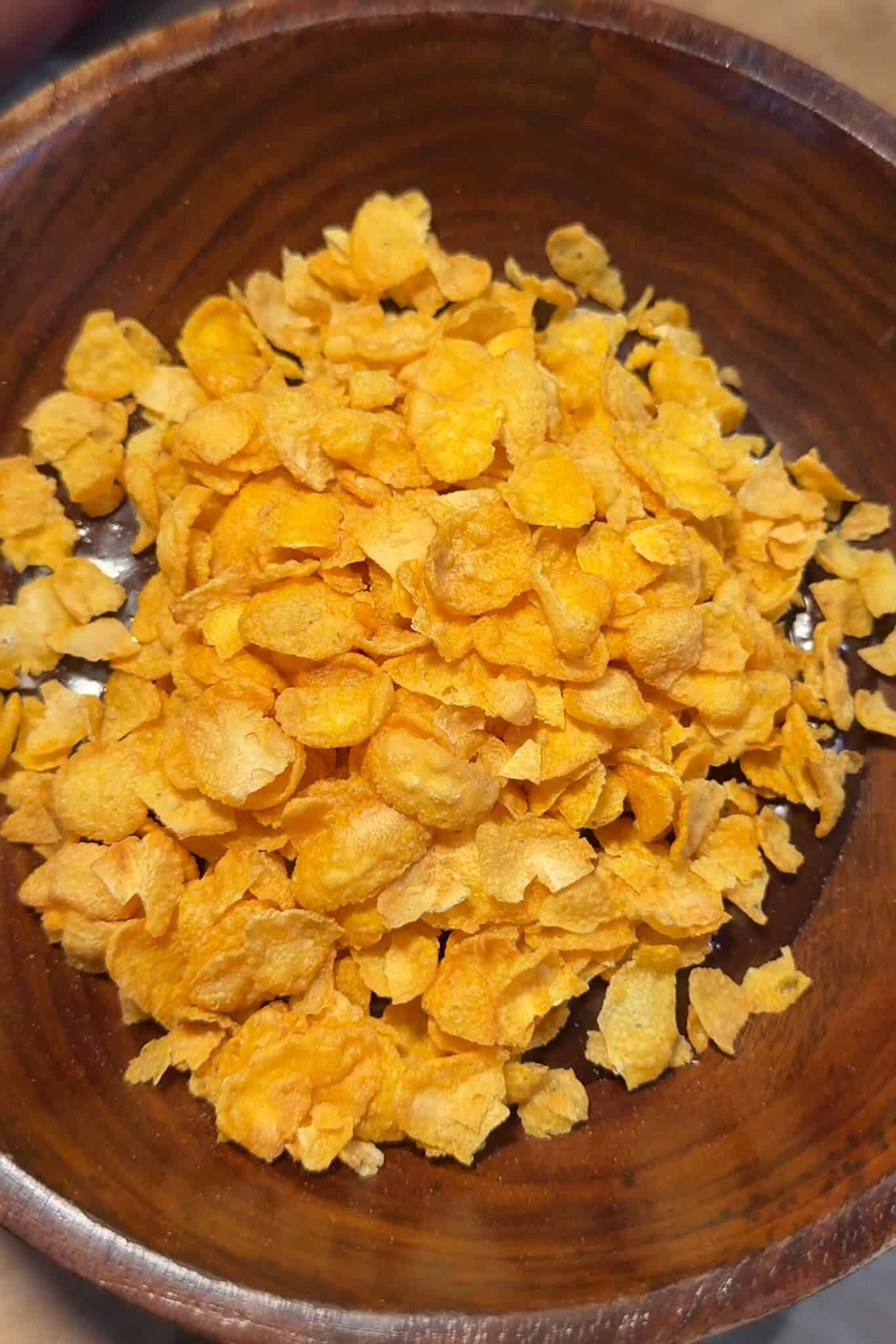 - Make the chocolate crunch topping: In a bowl, add chopped milk and dark chocolate along with coconut oil. Microwave in 30–40 second intervals, mixing well after each round until fully melted and smooth. Let the melted chocolate cool to room temperature, this is important so the cornflakes don’t go soggy. Once cooled, add the cornflakes and gently mix till evenly coated.