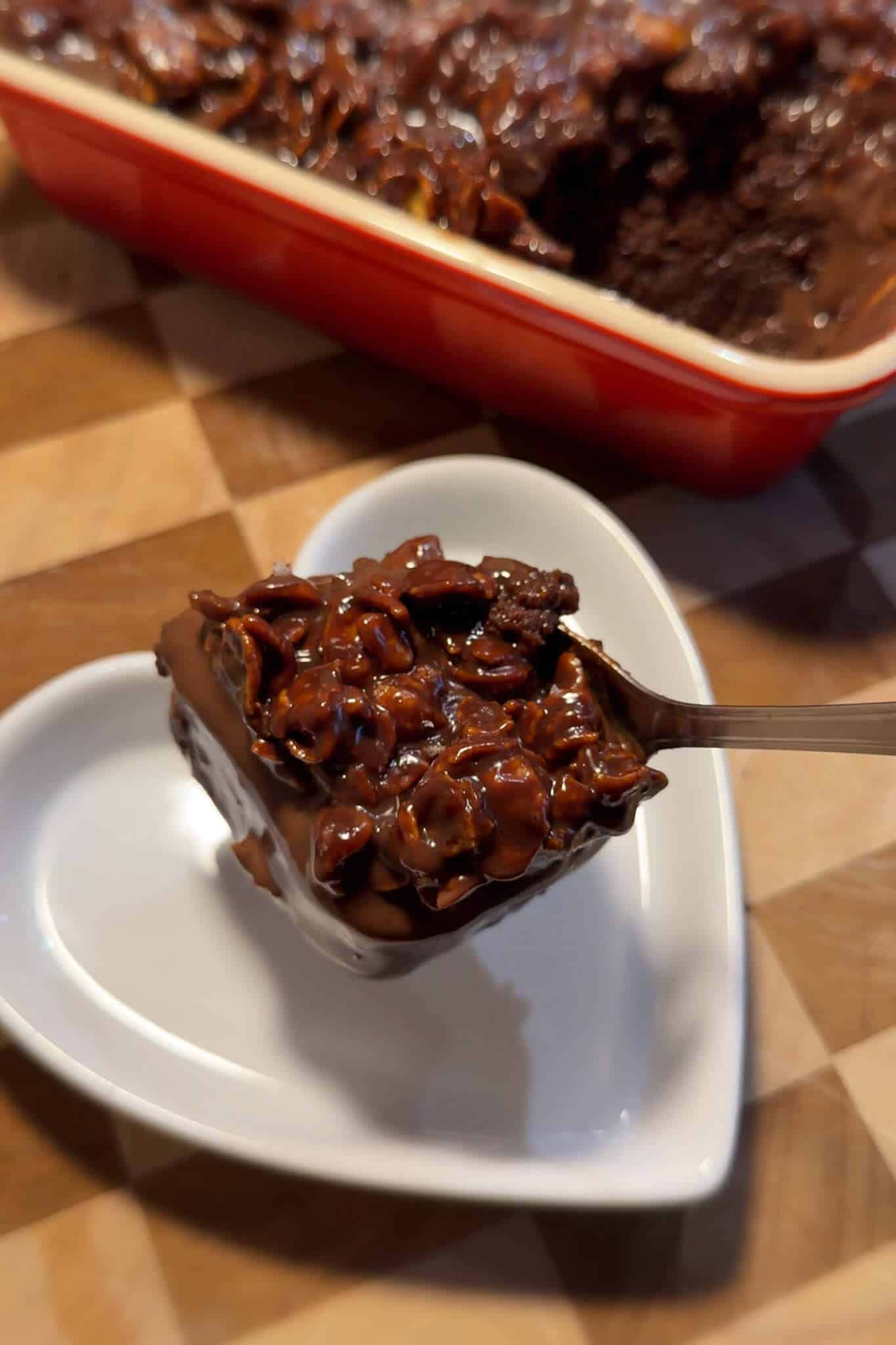 - Assemble and serve: Spread the chocolate cornflake crunch evenly over the soaked cake, finish with a sprinkle of flaky salt on top and just dig right in, enjoyy!
