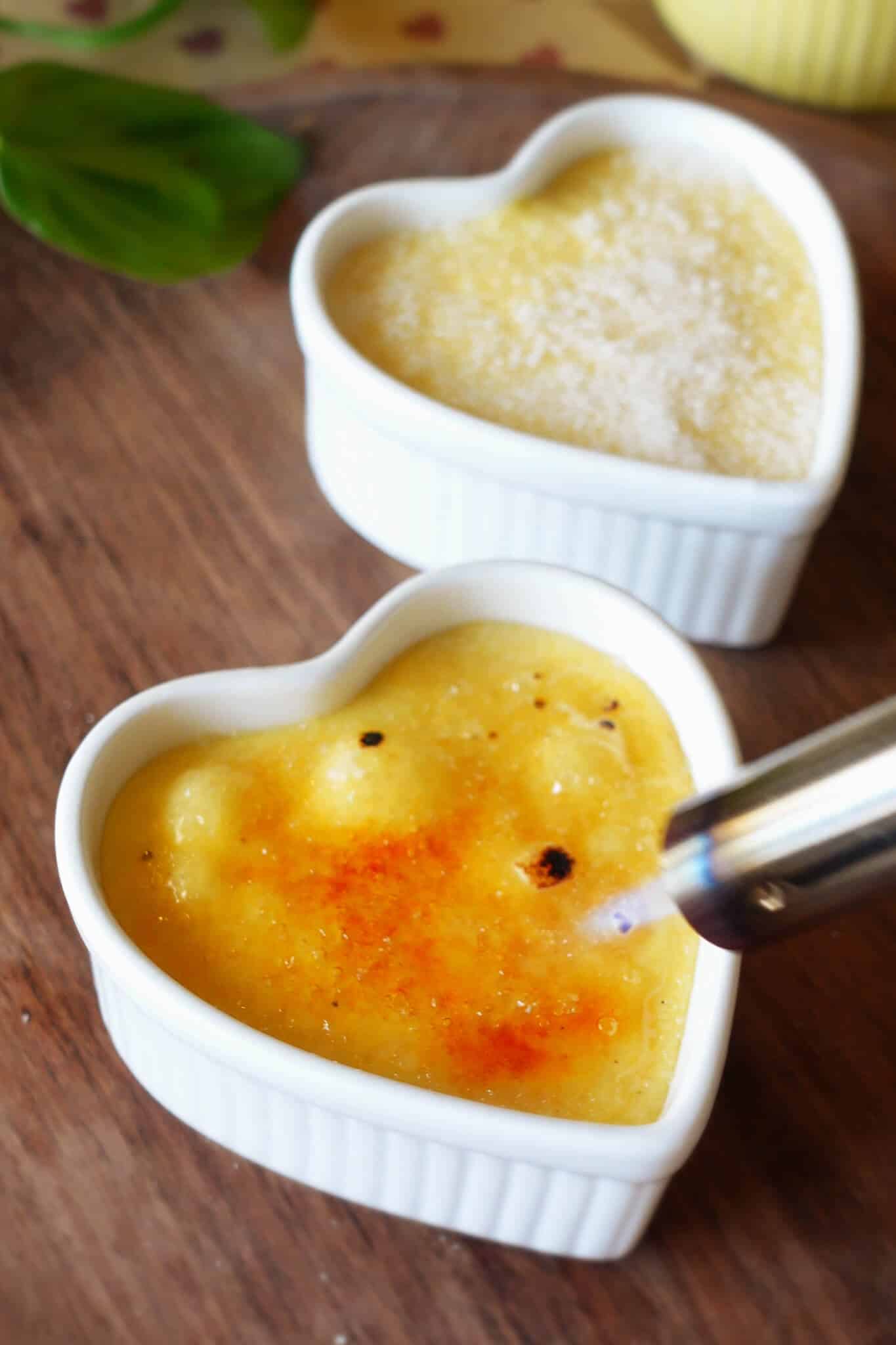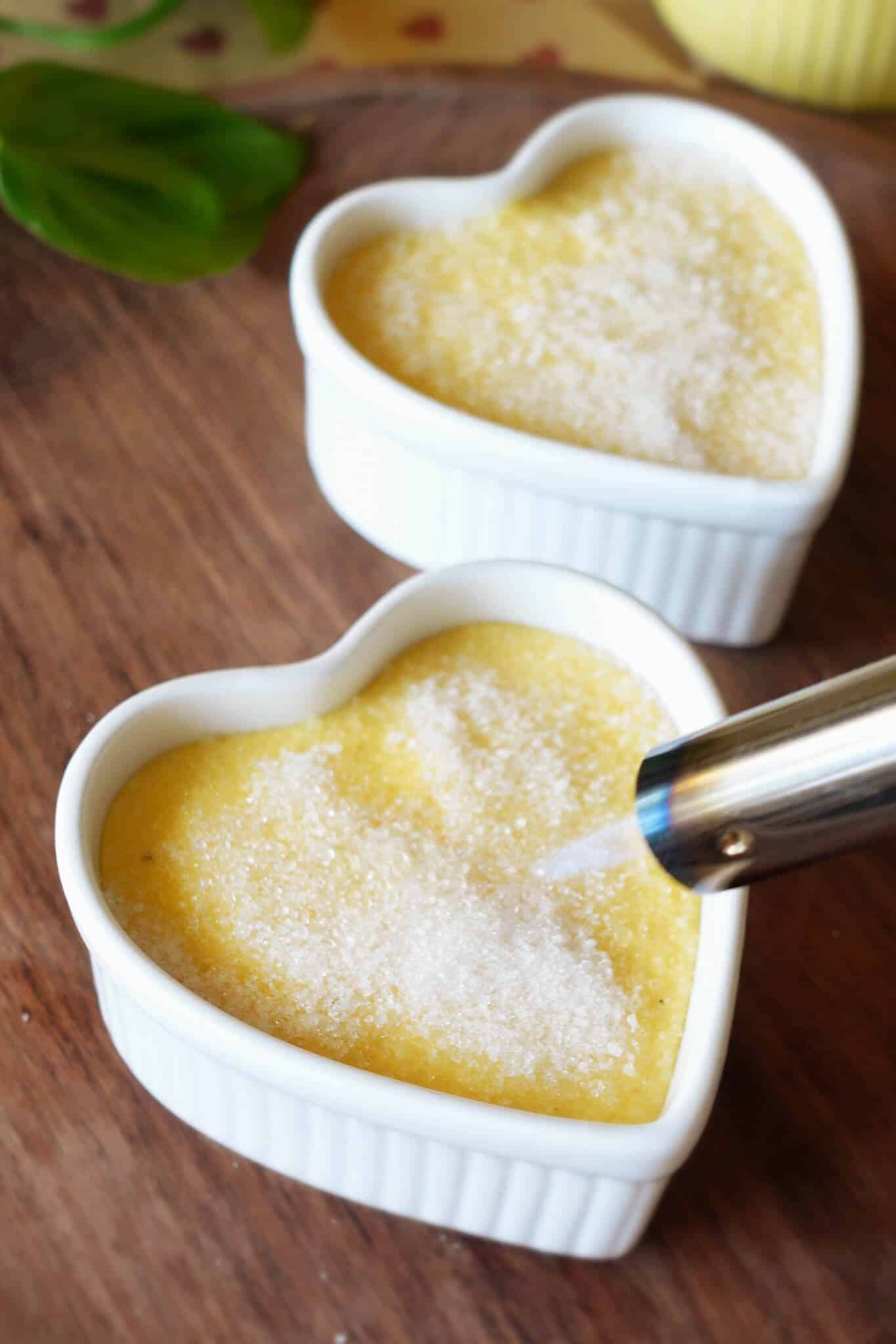 - Take the ramekins out of the fridge and top each one with a generous, even layer of sugar. Torch the sugar using a blowtorch. If you don’t have one, carefully heat the back of a spoon over direct flame and press it on the sugar to caramelise it.
