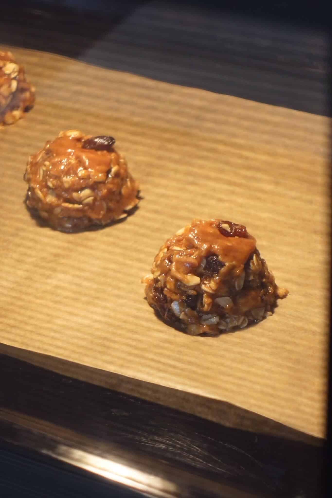 Once chilled, place the dough balls on a parchment lined tray and bake till the edges are set and the centre stays slightly gooey: