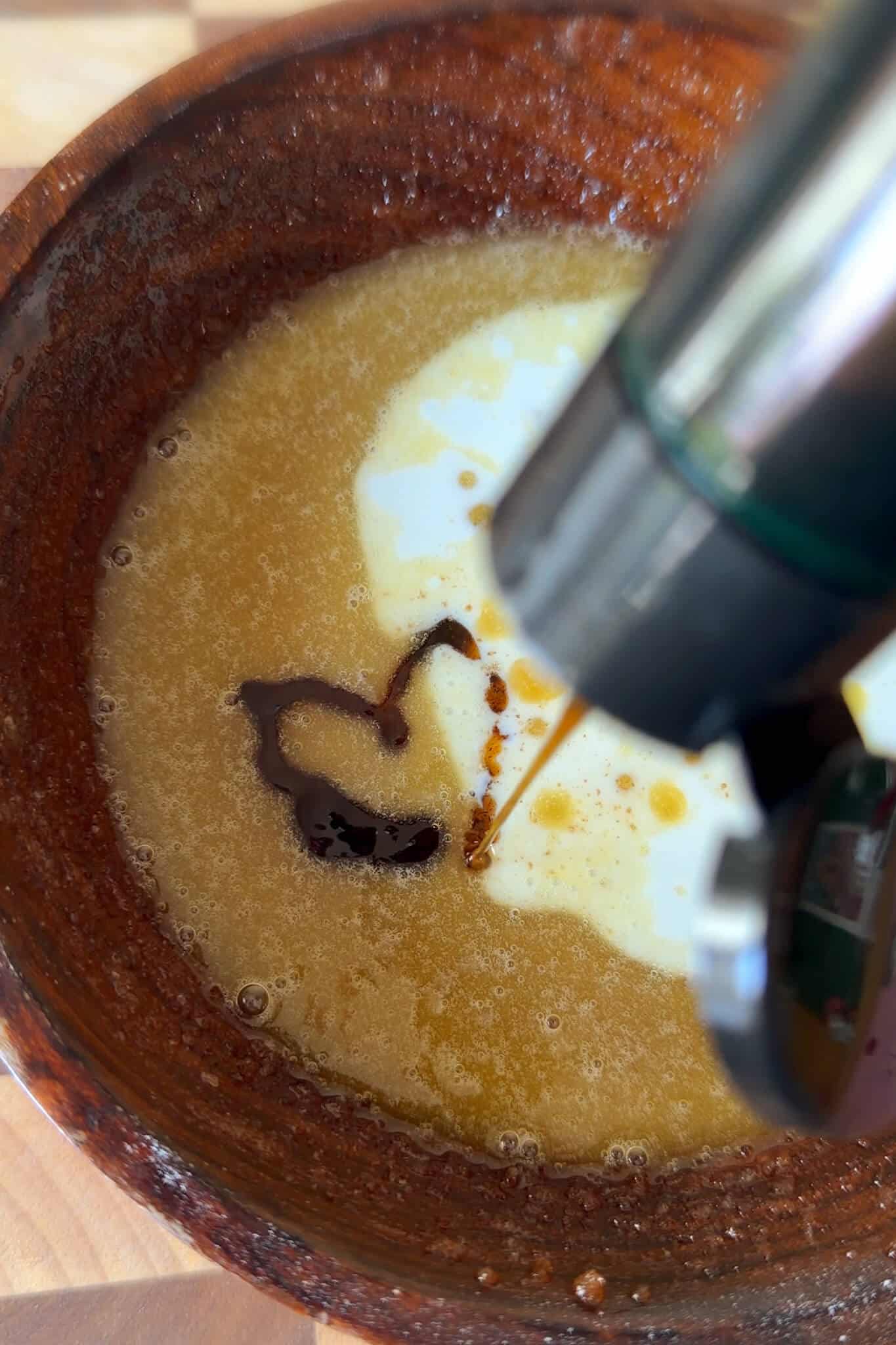 - In a mixing bowl, add brown sugar and white sugar. Pour in the slightly cooled but still warm brown butter and whisk till everything is smooth, glossy and the sugar is almost dissolved.