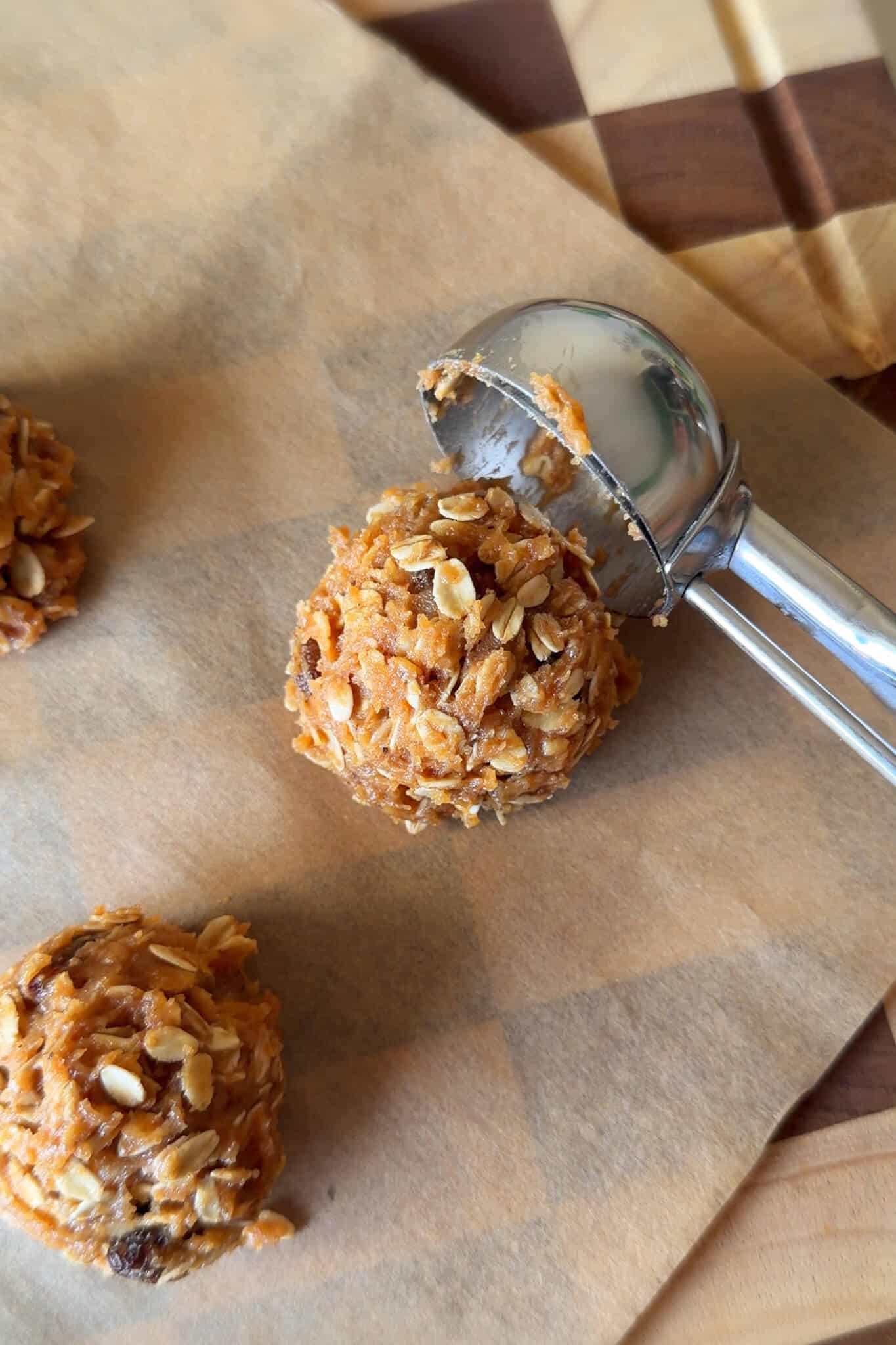 - Scoop out the cookie dough using a spoon or ice cream scoop and place the cookie dough balls onto a cling film lined plate. Cover lightly and refrigerate for atleast 1 hour. You can bake them straight away too but letting the dough rest helps the flavours develop and stops the cookies from spreading too much.