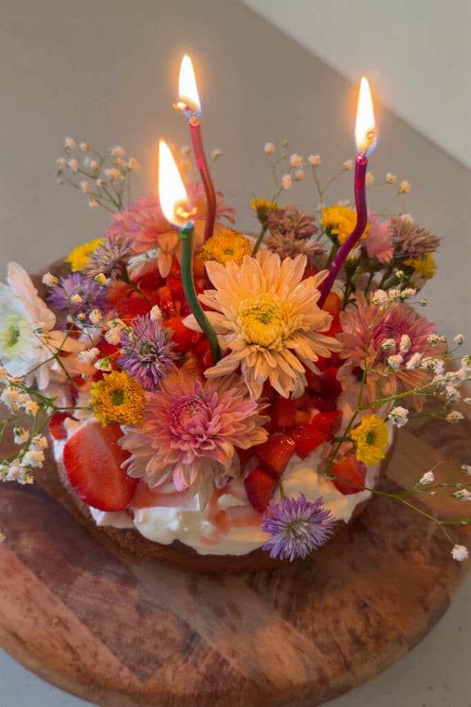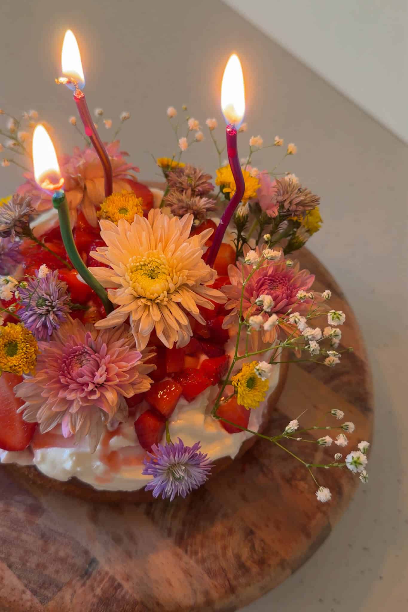 - Top the cooled cake with the mascarpone whipped cream and spoon over the juicy strawberries. You can decorate with fresh flowers like I did or anything you like, slice and serve!