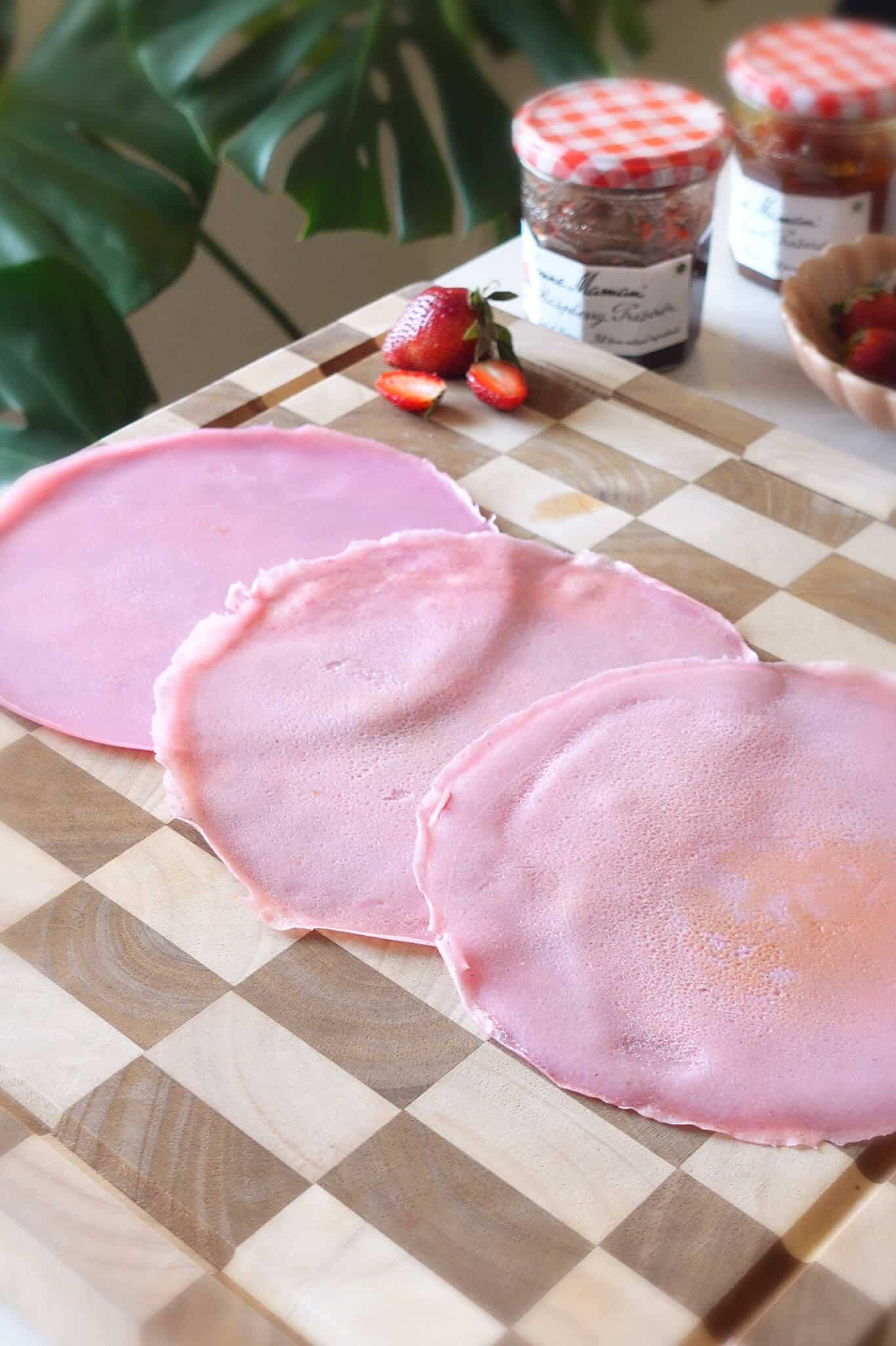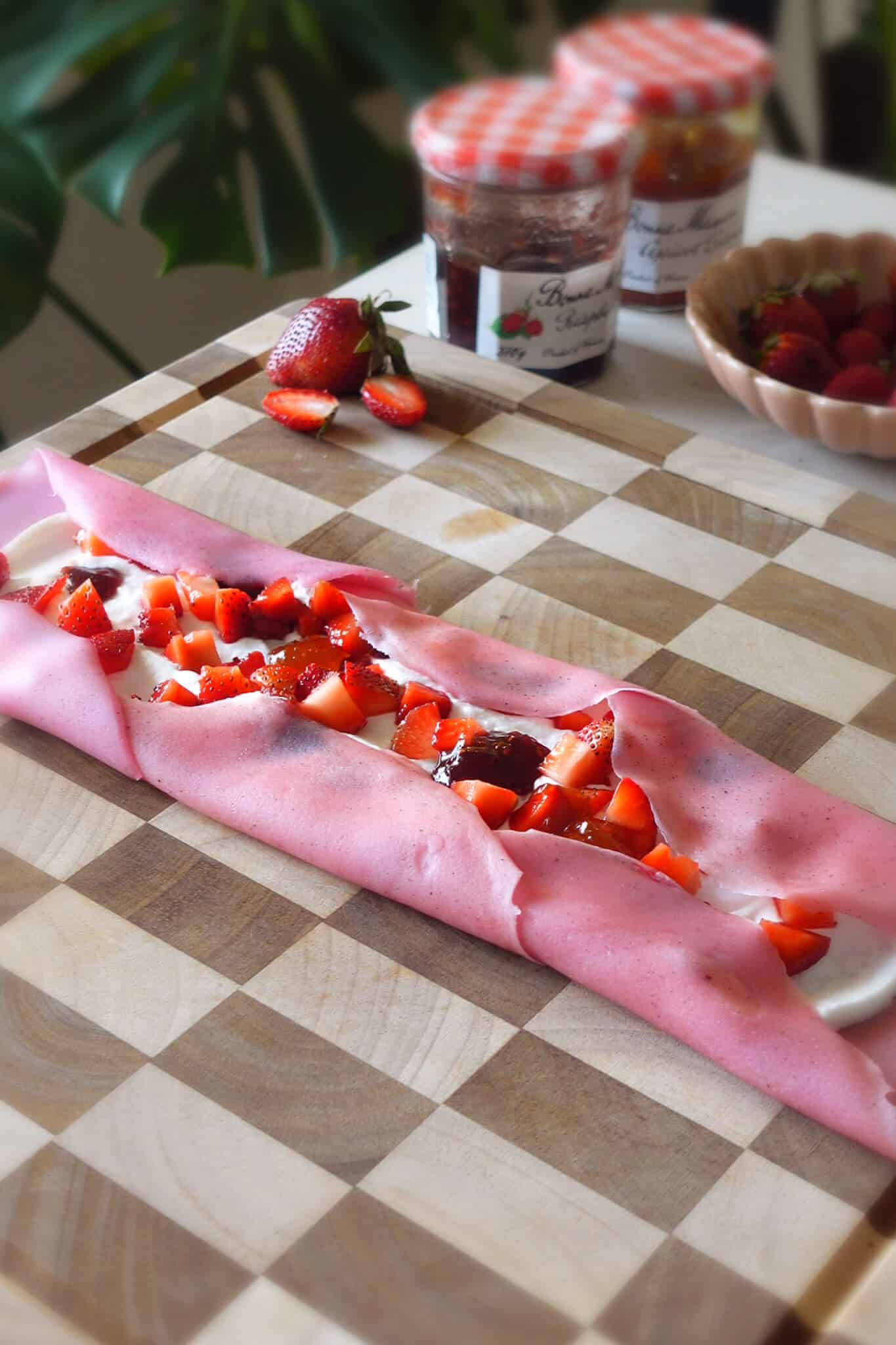 - Make the crepe batter: Mix milk with all purpose flour, starch, powdered sugar, melted butter, dragonfruit powder and vanilla. Whisk well and strain once to make sure the batter is smooth. Refrigerate for 1 hour if you can. It helps make smoother crepes but you can cook them right away too.
