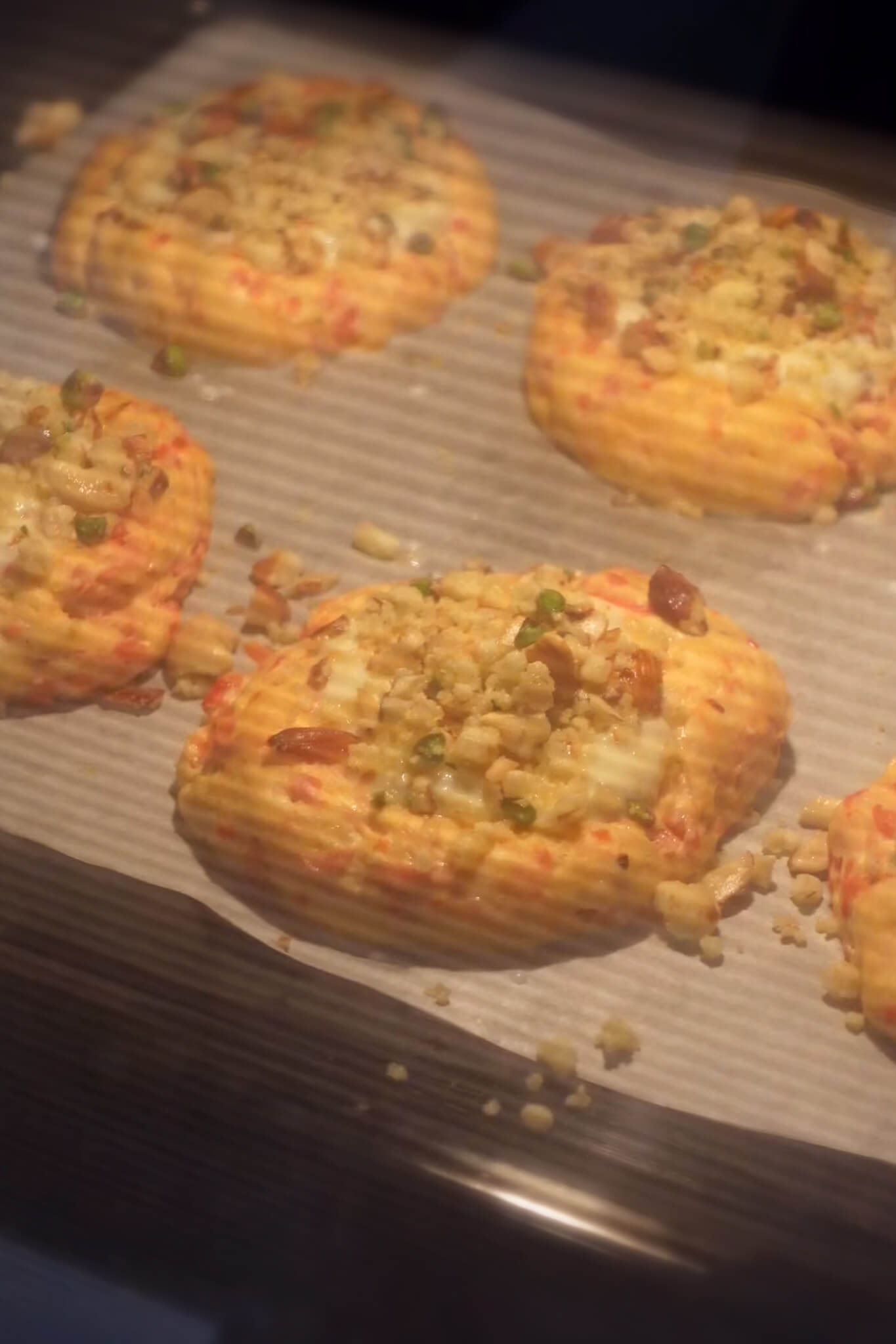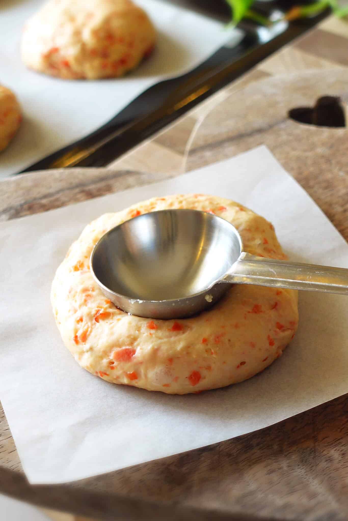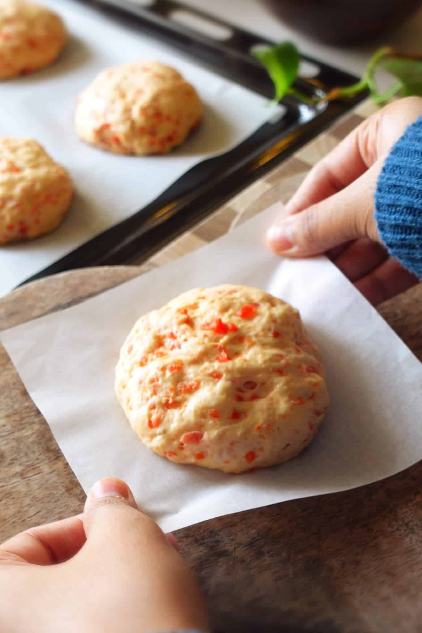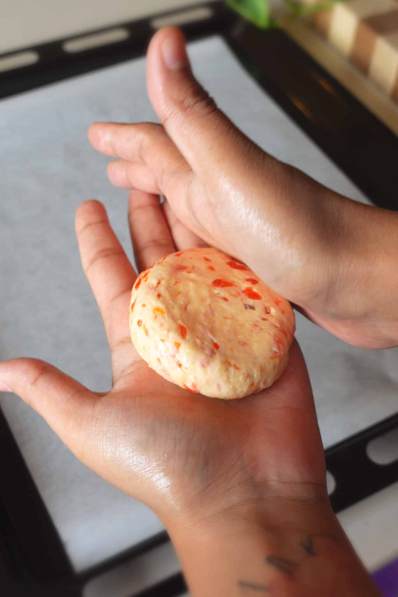 • Flatten slightly with your palm and place on a parchment lined tray.