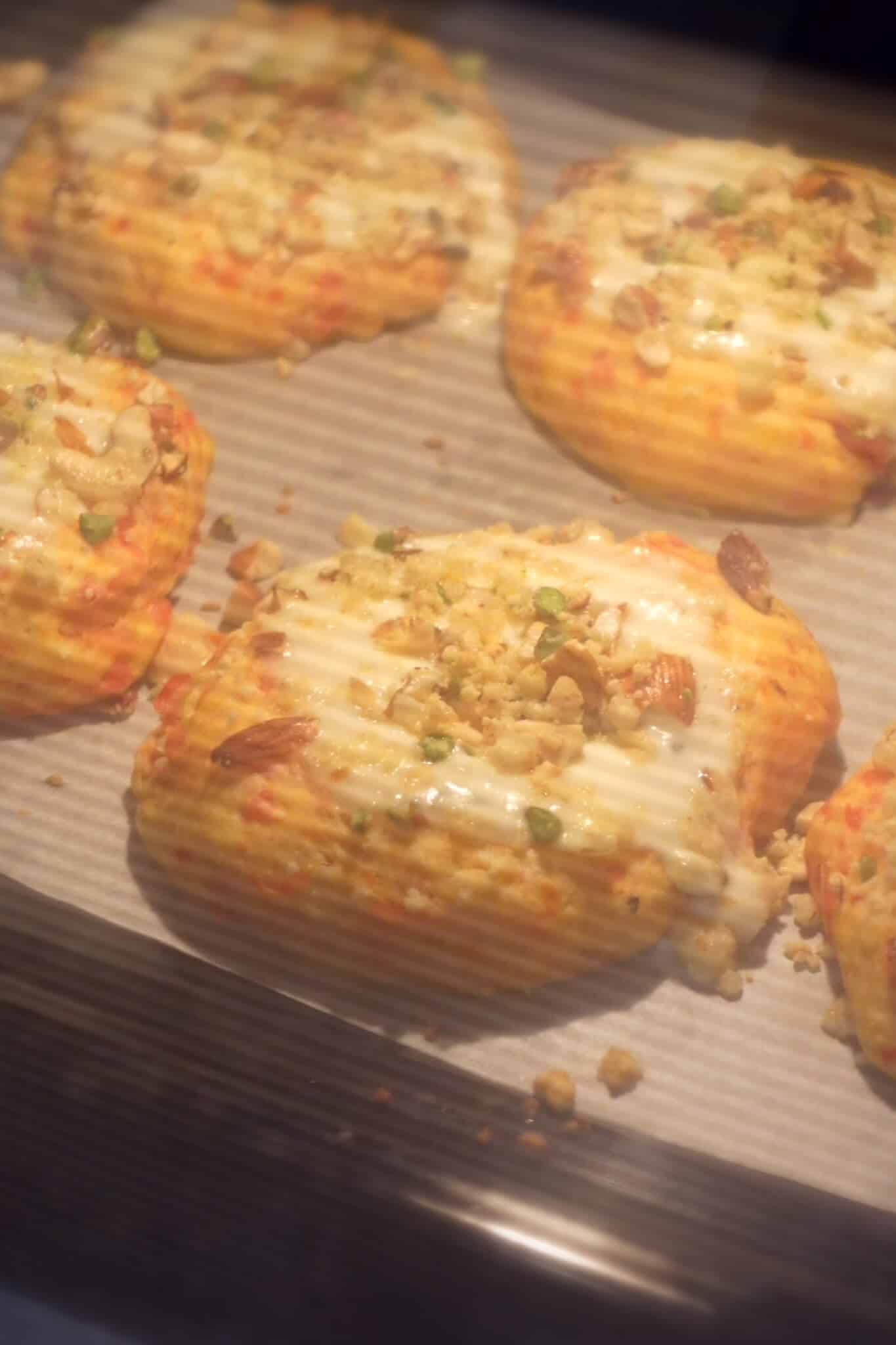 Once proofed, add the completely cooled khoya rabri filling to the centre of each bun and top generously with the ghee-roasted nuts and khoya. Bake the buns in a preheated oven at 180°C for 15–20 minutes or till they are cooked through and lightly golden on top. If using an airfryer, cook at 170–175°C for 10–15 minutes.