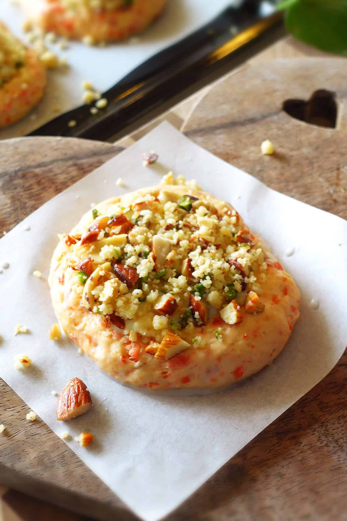 In a separate bowl, combine the all purpose flour and salt. Add the proofed carrot mixture to the dry ingredients and mix using a fork, spatula or chopsticks until a shaggy dough forms. At this stage, you can also mix in some grated carrots for extra colour, if you like. Add the ghee and knead the dough for 5–10 minutes until it comes together into a soft, tacky dough that is surprisingly easy to work with. Cover the dough and let it proof in a warm environment for 90 minutes to 2 hours or till it has doubled in size.