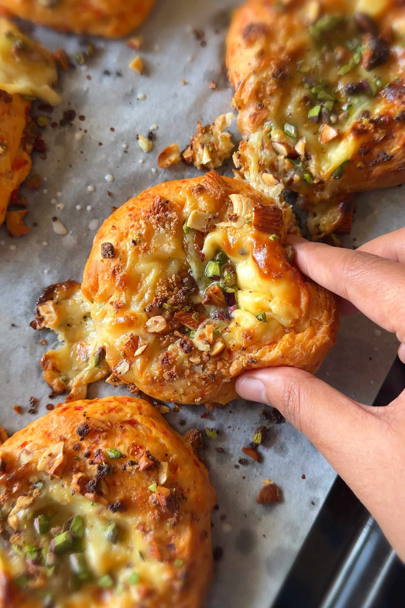 These gajar ka halwa rabri buns would definitely be on the winter menu if I ever opened a cafe. I didn’t want them to just feel carrot flavoured, I wanted them to actually taste like gajar ka halwa. So instead of adding carrot purée to a dough, I cooked the carrots the exact same way halwa is made, slowly simmered in full fat milk with cardamom, kesar and sugar and then used that to make the dough itself. I was originally going to fold khoya into the dough but I knew it would get lost once baked. Turning it into a khoya rabri filling made more sense because it keeps that milky richness intact and gives you a soft, creamy centre. It’s basically everything you expect from gajar ka halwa: just baked into a really soft creamy bun!