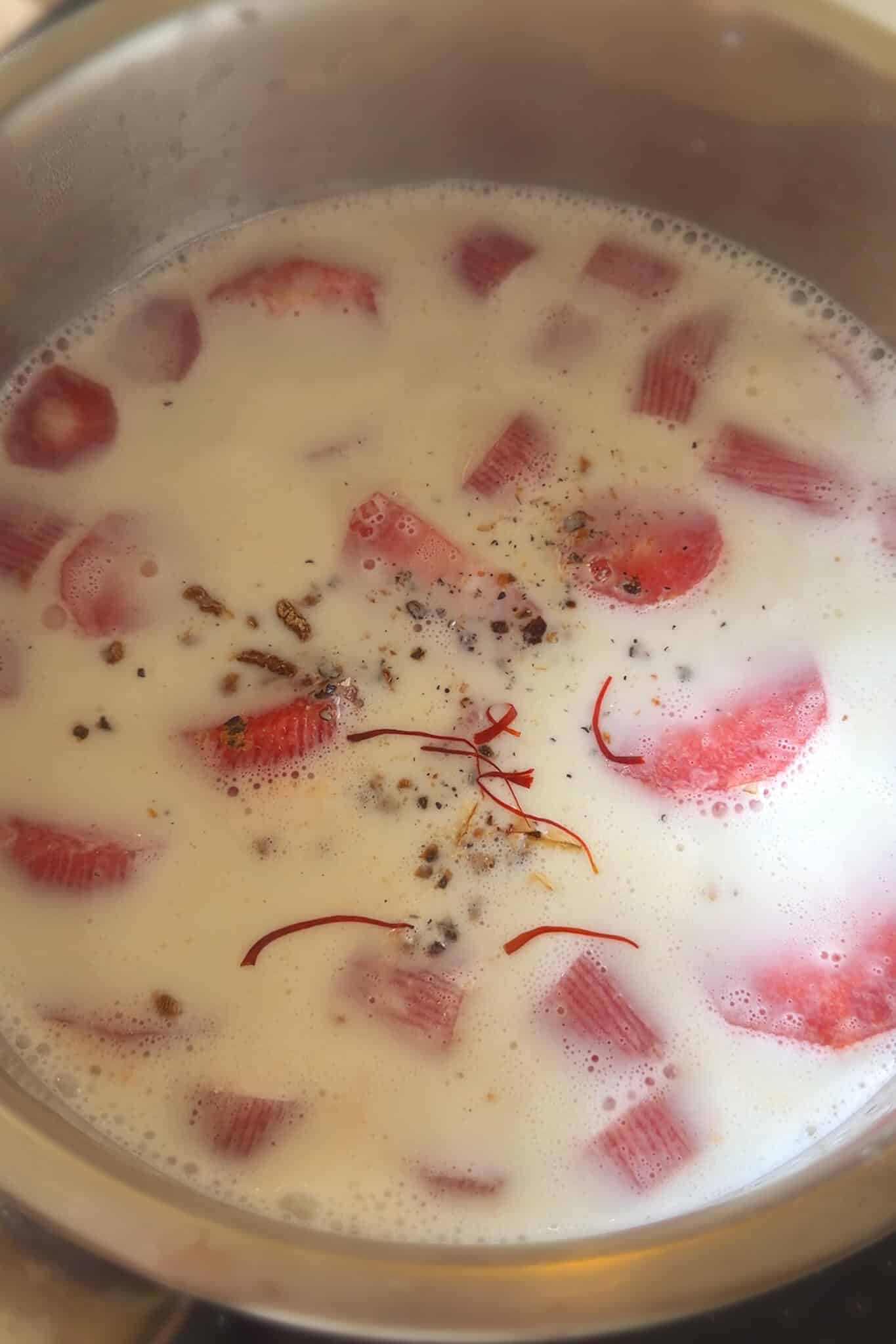Start by peeling and chopping the red carrots. Add milk to a pot and place it on low heat. Once the milk is warm, add the carrots along with the sugar, crushed cardamom pods and kesar. Let this mixture simmer gently for 45 minutes to 1 hour, stirring occasionally until the carrots are completely softened and fork tender and the milk has reduced slightly, just like gajar ka halwa.