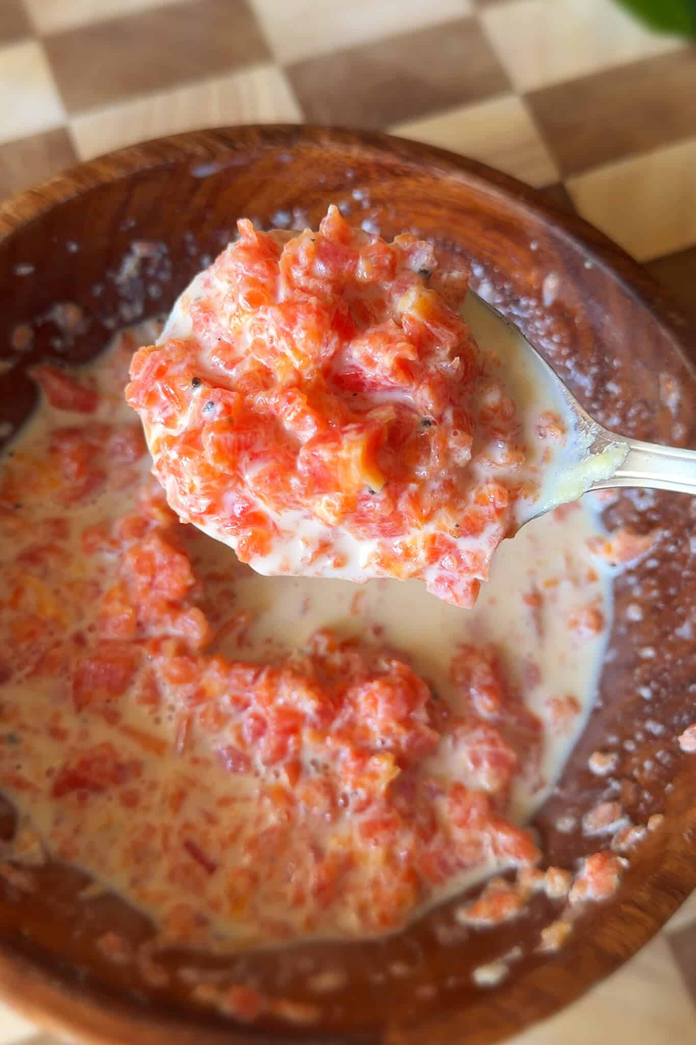• Transfer the hot carrot milk mixture to a bowl and mash it well while it’s still hot. By the time you’re done mashing, the mixture should be warm.