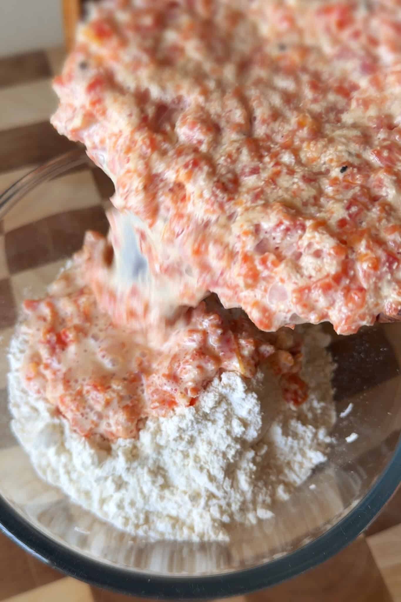 • Add the wet mixture to the dry ingredients and mix using a fork, spatula or chopsticks until a shaggy dough forms.