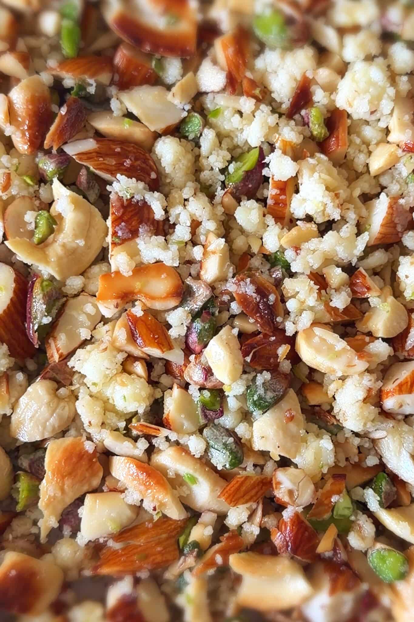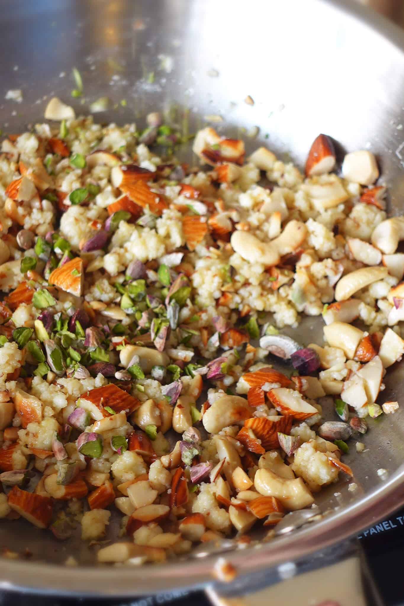 • Add chopped cashews and almonds and cook till lightly golden and aromatic.