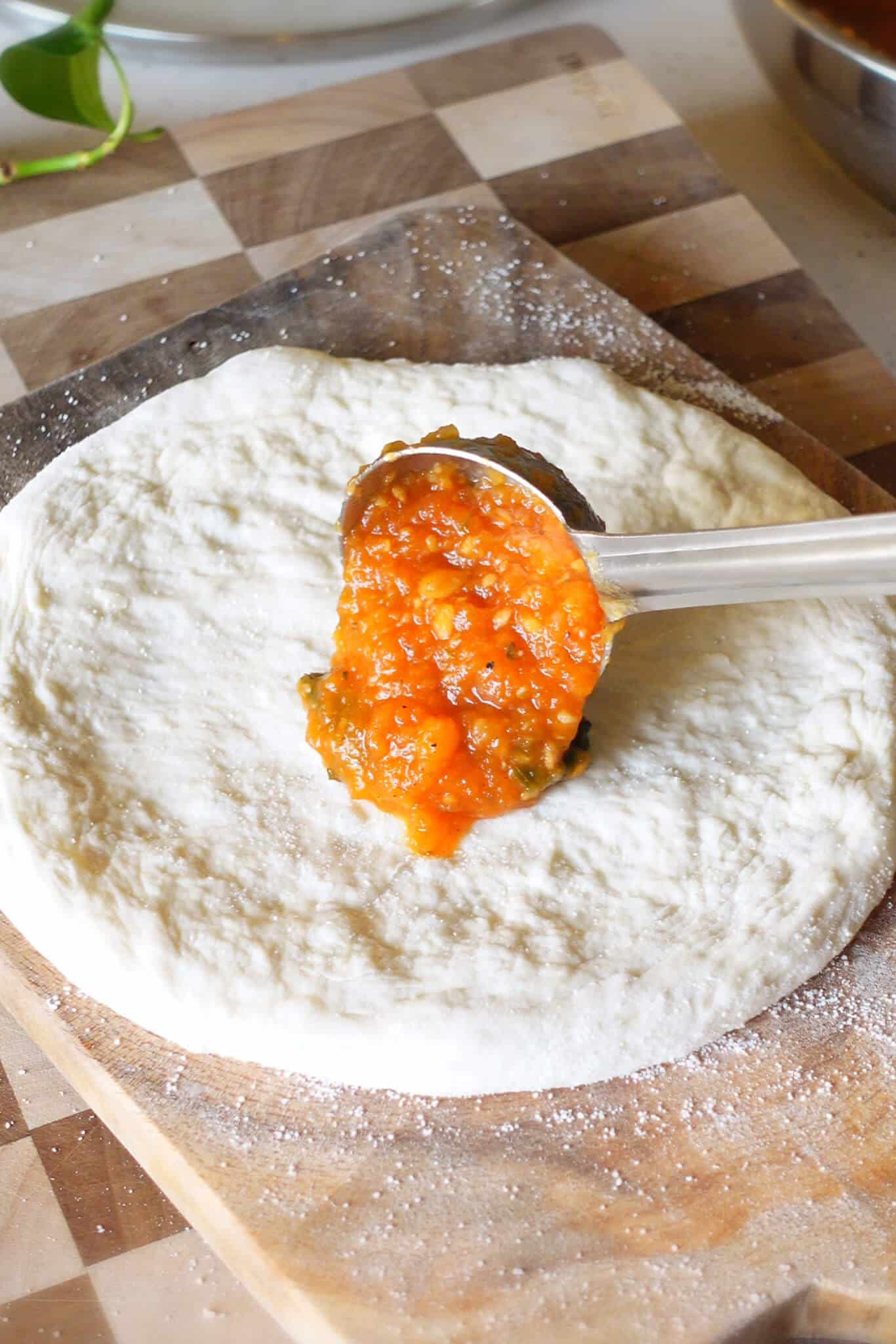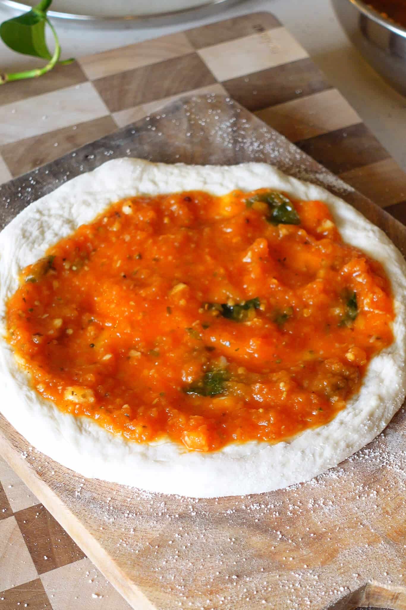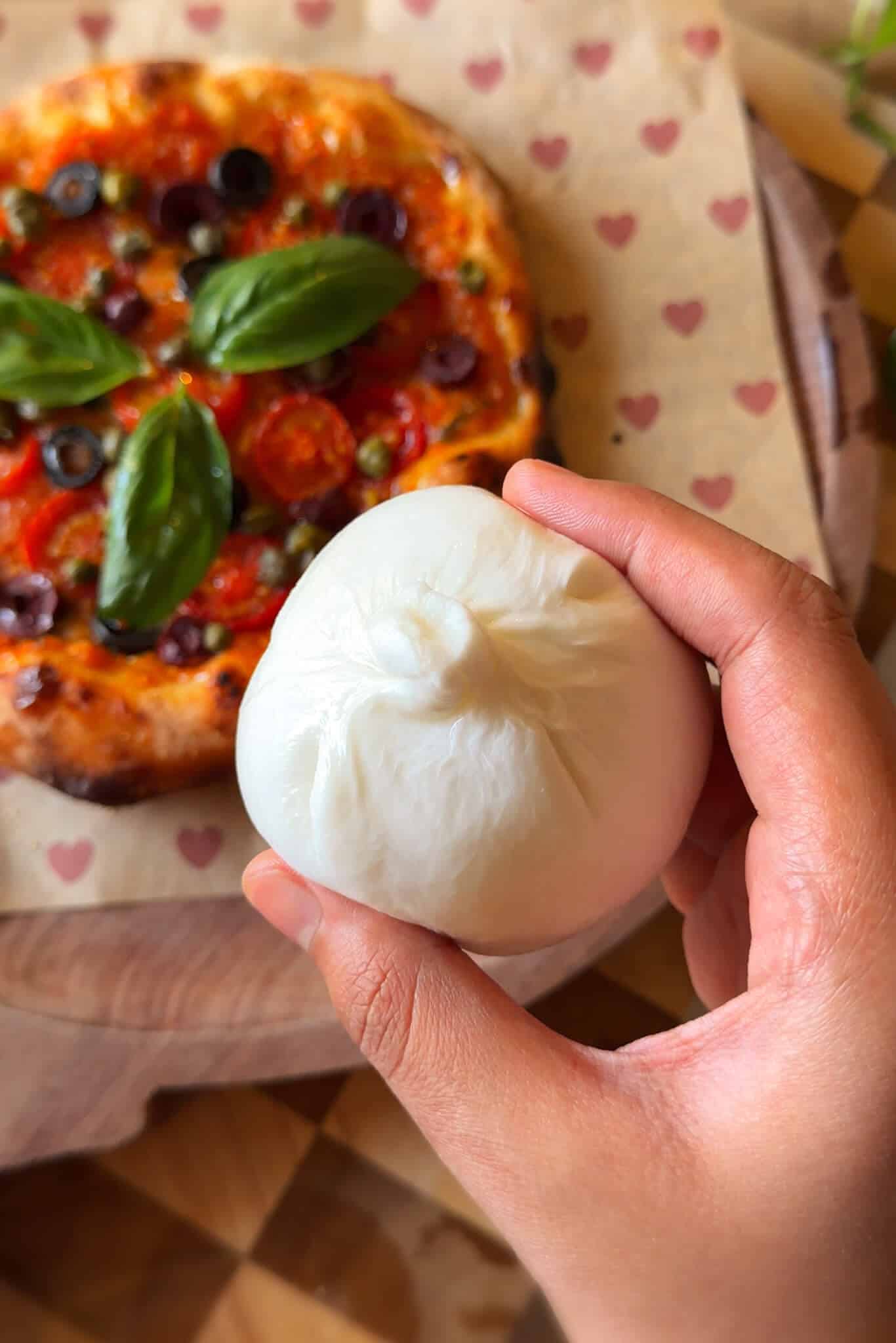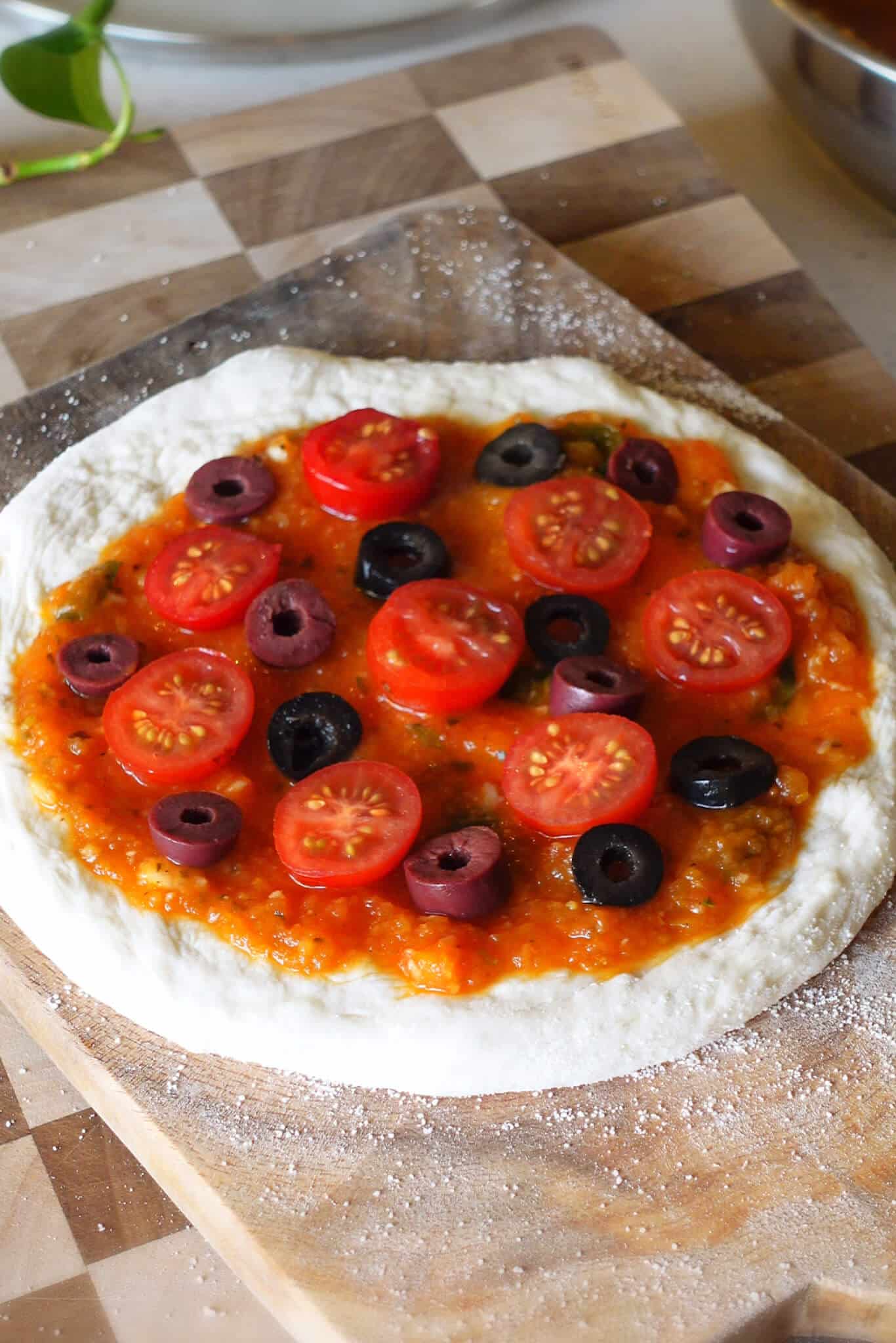 - Place the stretched dough onto a lightly floured surface. Spread a generous layer of tomato sauce over the base and top with cherry tomatoes, kalamata olives, black olives and any other toppings you like. If using mozzarella, add it now, I skipped cheese at this stage because I was finishing the pizza with burrata.