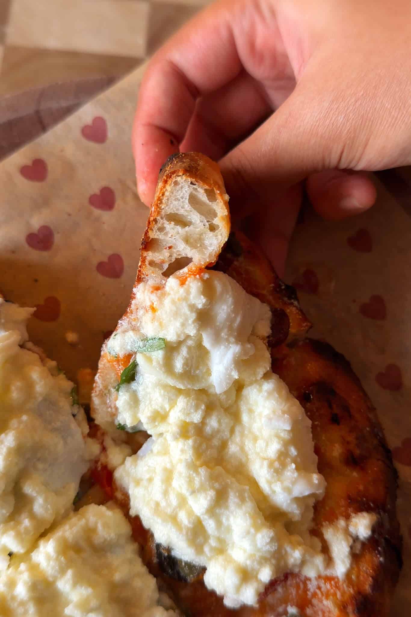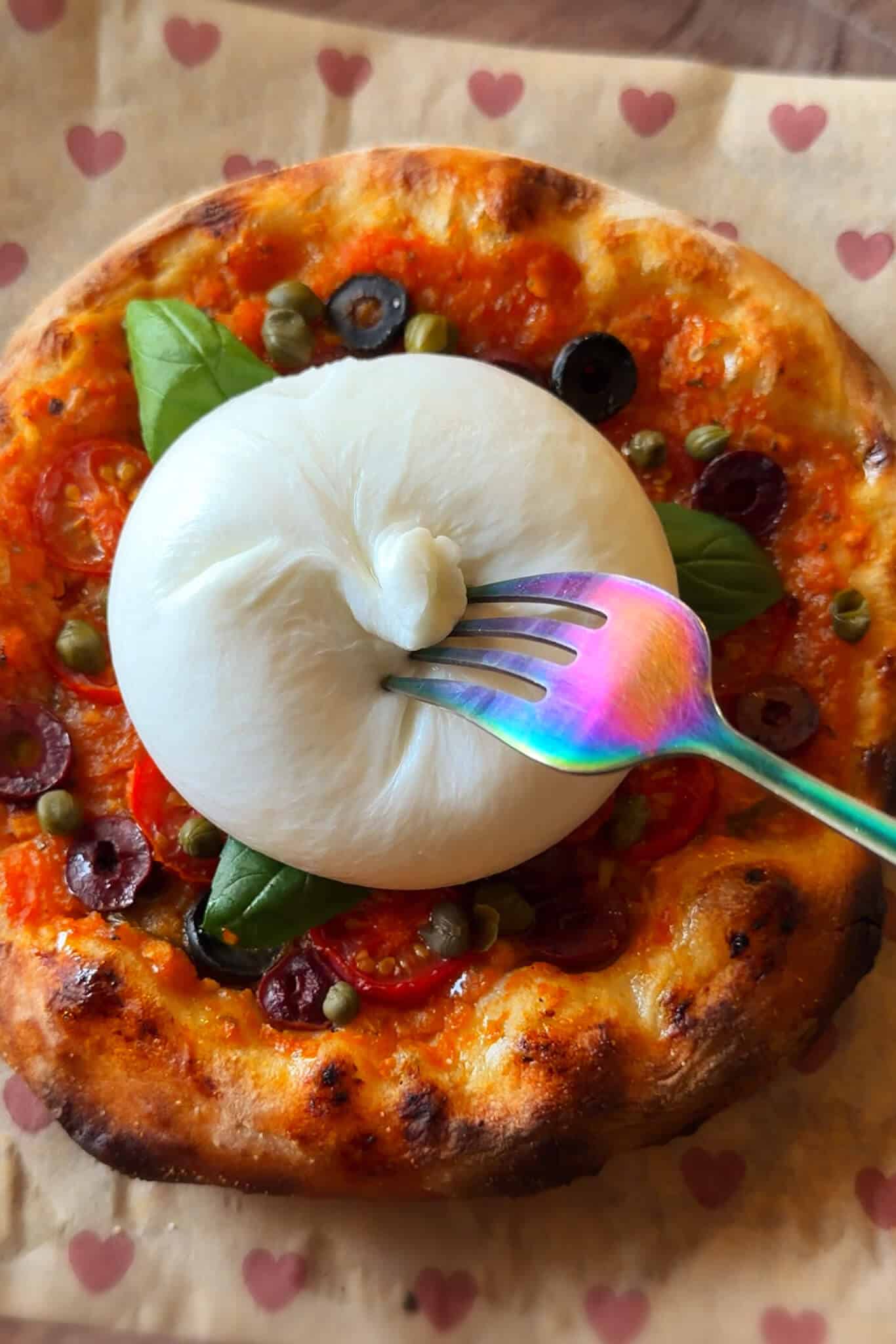 - Place a whole burrata on top, tear it open, spread it gently over the pizza, slice and serve, enjoyy!