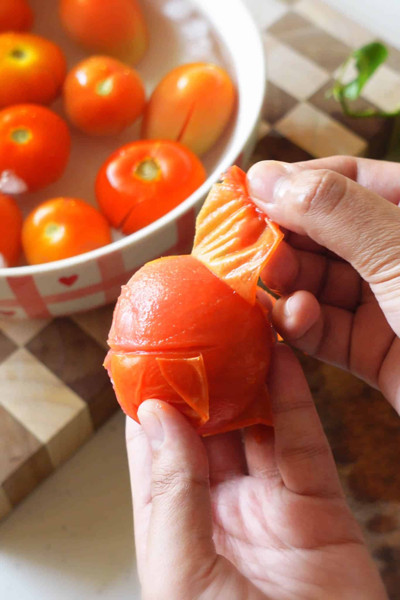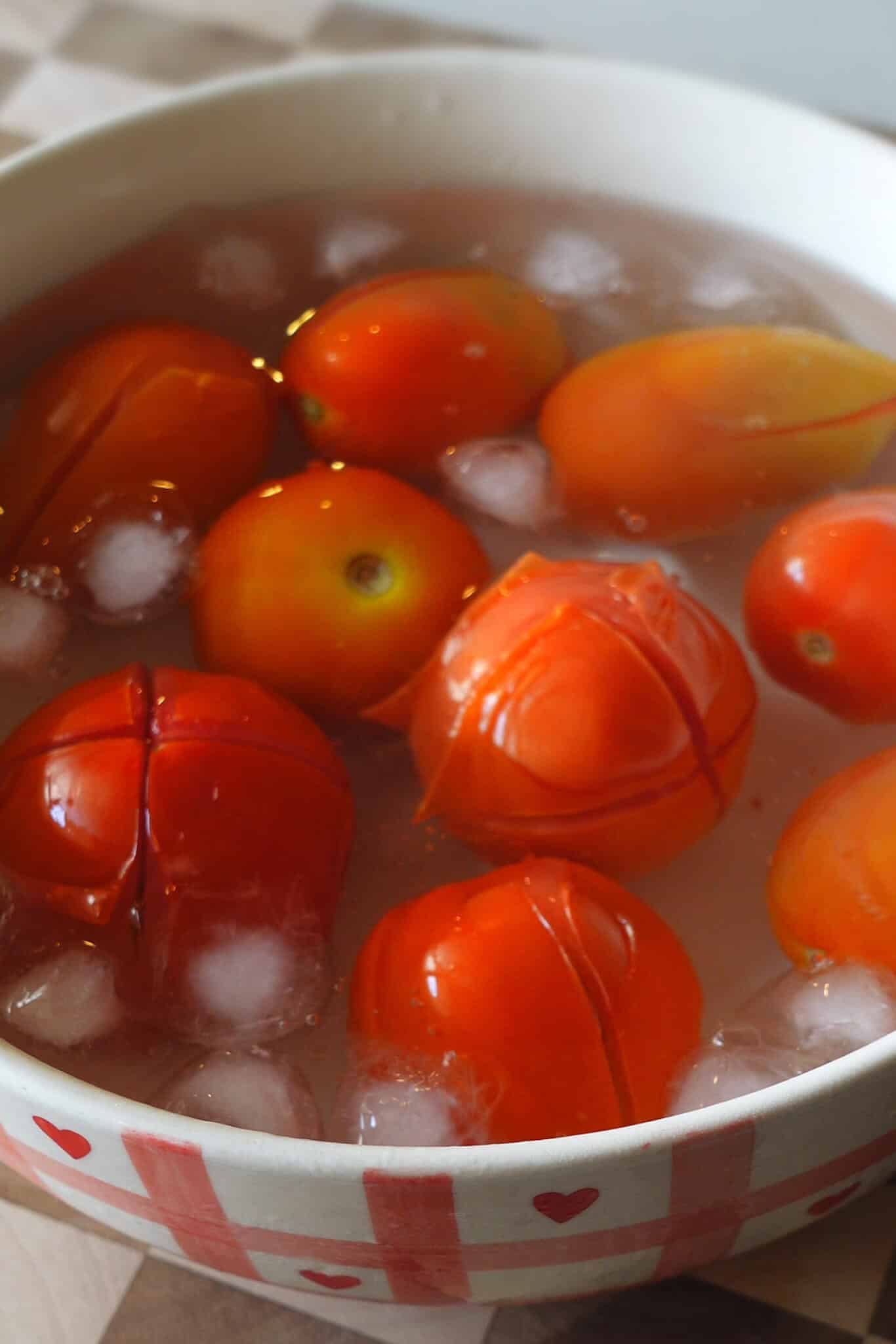 - Bring a pot of water to a boil, add the tomatoes and blanch them for about 1 minute or till the skins start to loosen. Transfer the tomatoes straight into a bowl of ice cold water and let them sit for 30 seconds.