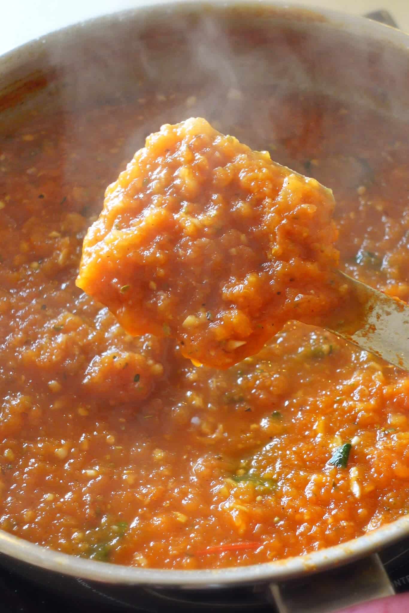 - Pour in the blended tomatoes, season with salt and pepper and mix well. Let the sauce cook low and slow for 20–25 minutes, stirring occasionally till it thickens and turns a deeper, brighter red.