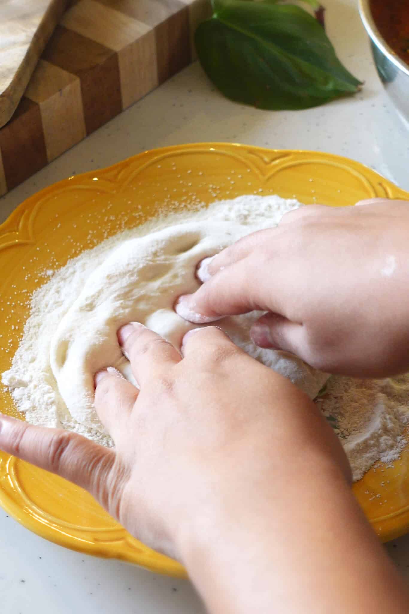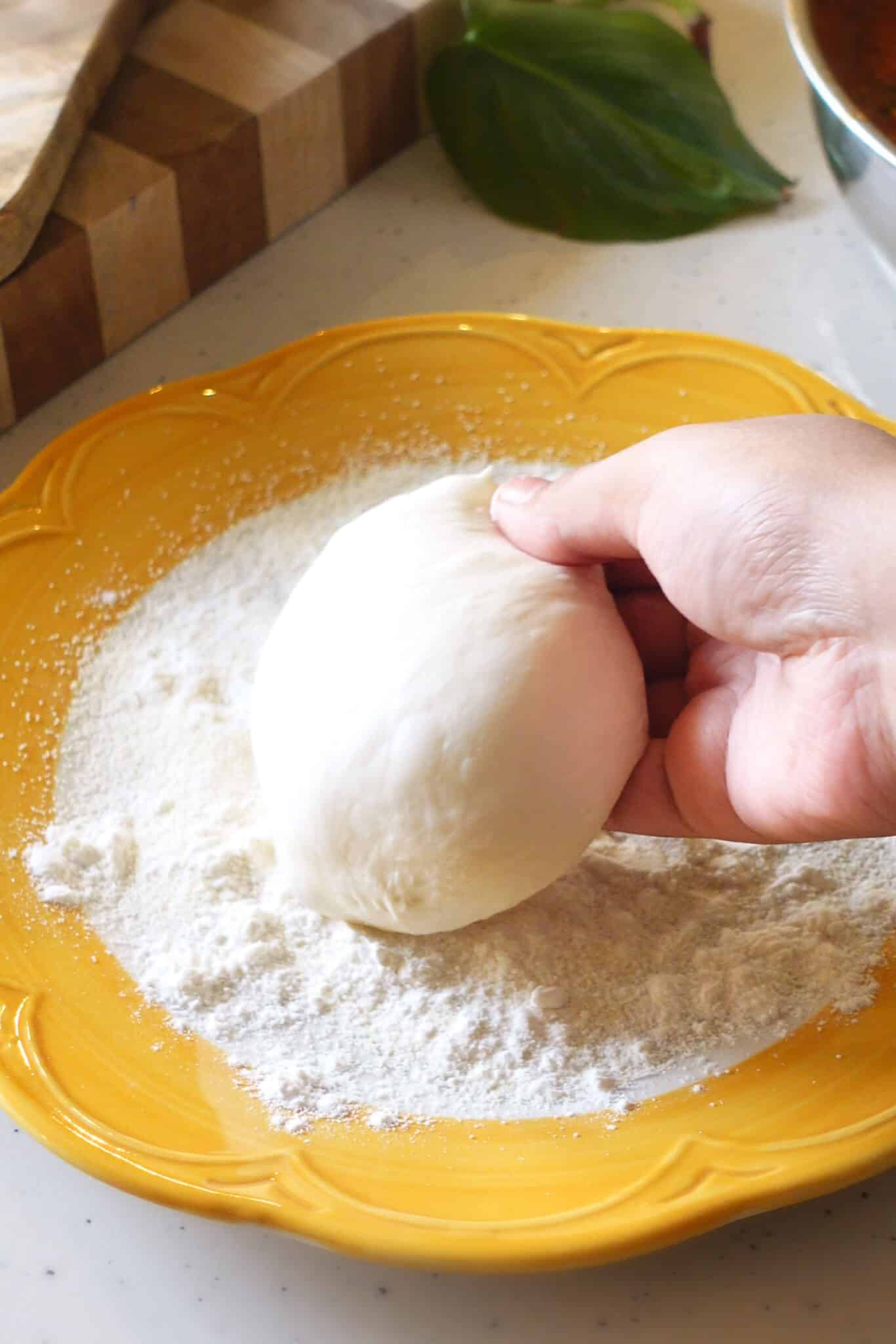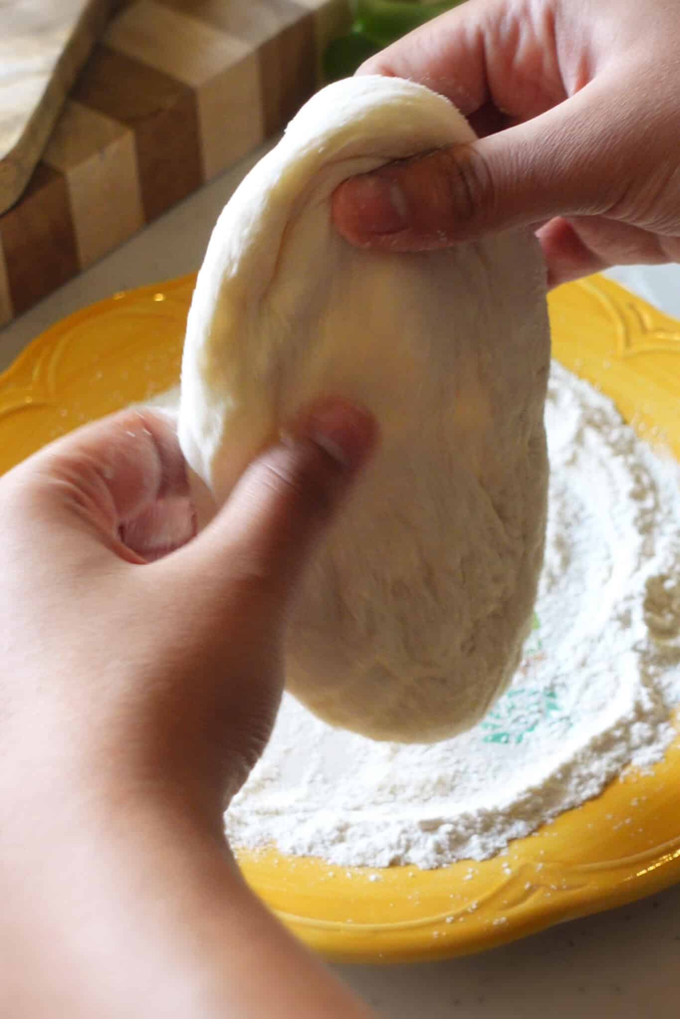 - On a plate, mix 50% fine semolina and 50% all purpose flour. Place the dough onto this mixture to prevent sticking. Using your fingers, gently press the dough out. Lift it up and stretch it carefully using both hands, keeping the edges slightly thicker and the centre thinner.