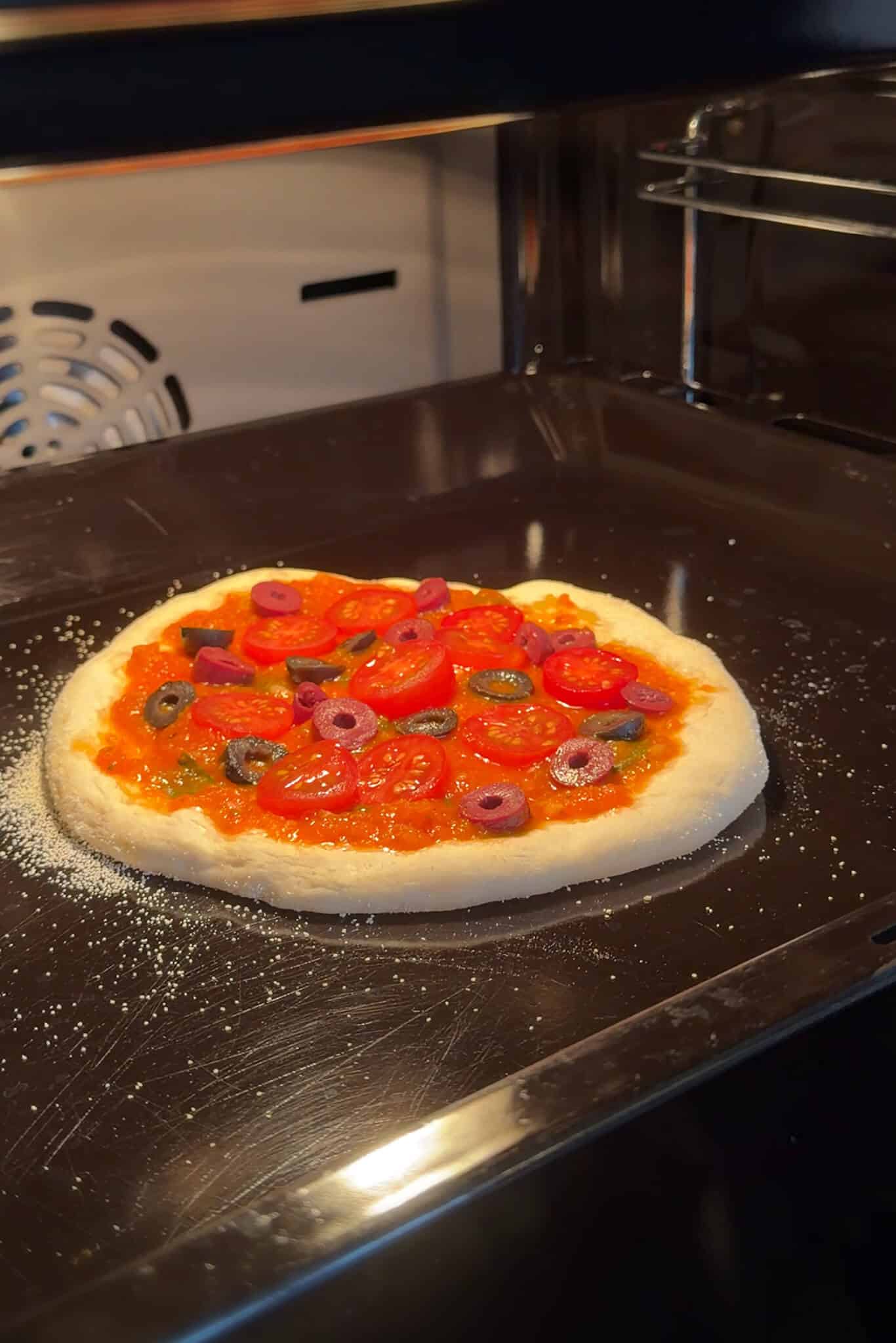 - Assembling & baking the pizza: Preheat the oven at 350°C (or the highest temperature your oven allows) for 15 minutes with a baking tray inside.