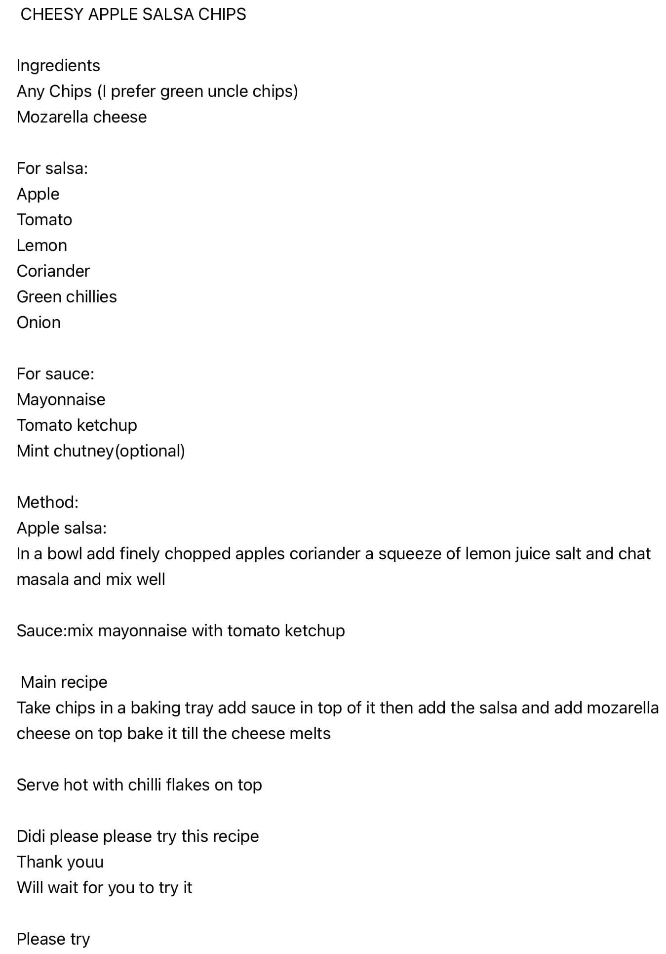 This smells amazing. I had my doubts about combining apple with ketchup, but it works. It is mostly savoury with the apple adding a touch of sweetness and crunch. The chips gets a bit soggy because of the toppings and the salsa but it still tastes very nice. It is decently spicy too, which is something I did not think it would be.