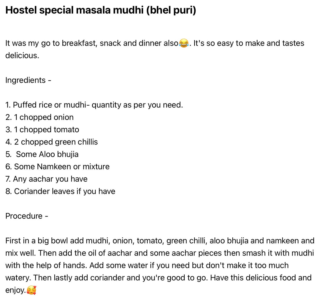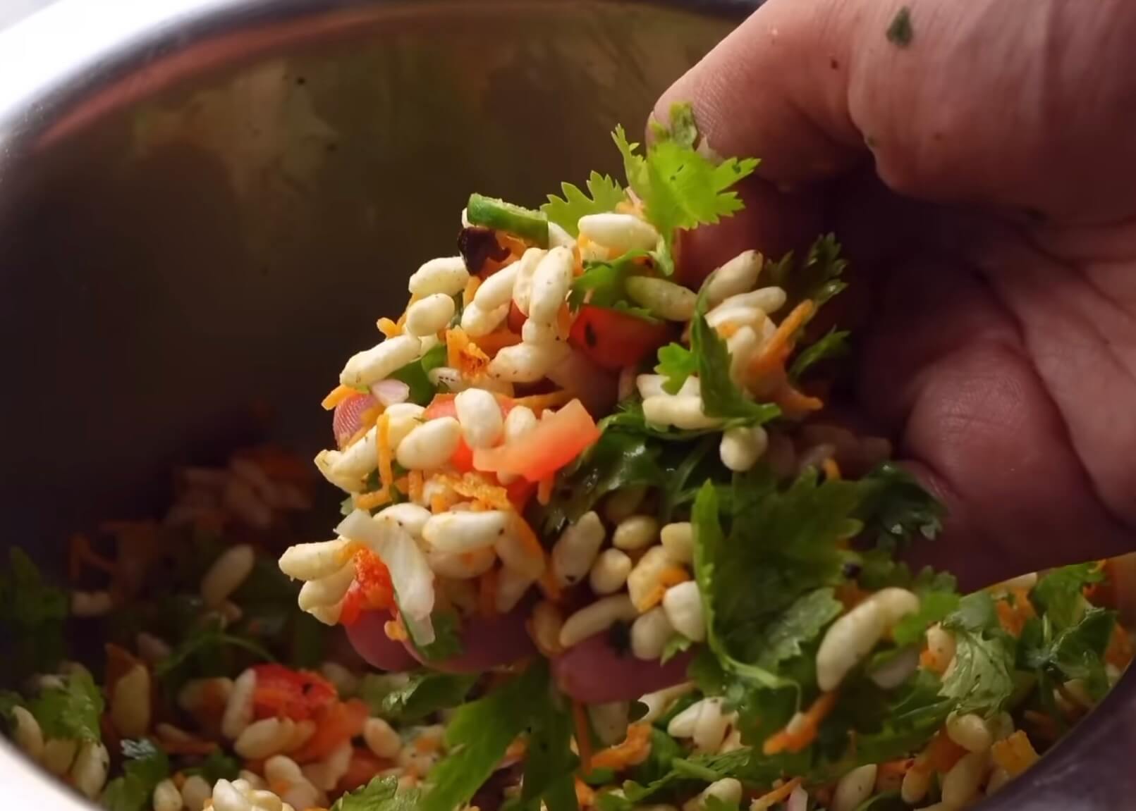To get max flavour, you have to mix the muri with your hands. I’ve had my fair share of masala muri but never with no seasoning or lemon juice, but this one actually tastes really nice because we are using aloo bhujia which adds that tang and achaar acts as a great lemon replacement and for how low effort this is: this tastes really, really good.
