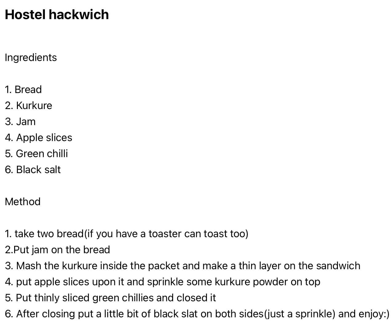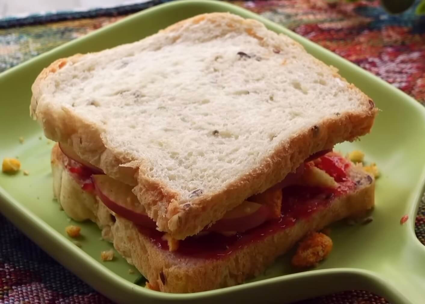 With this recipe, I was confused with the taste but I didn’t hate it. I think fruit jam and apples are sweet and masala kurkure plus green chilli is spicy: so together it’s a sandwich which is sweet and spicy which balances the flavours. I am not sure if I will make this again for myself, but it is edible and might be someone’s yum.