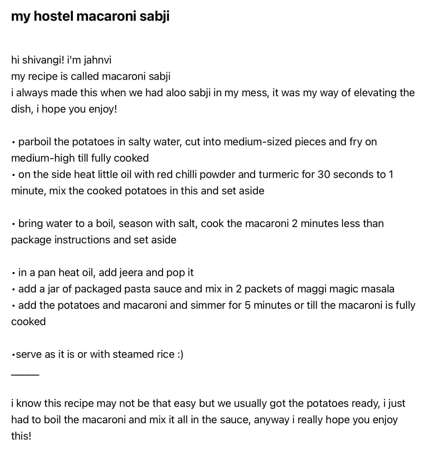 Jahnvi’s macaroni sabzi
