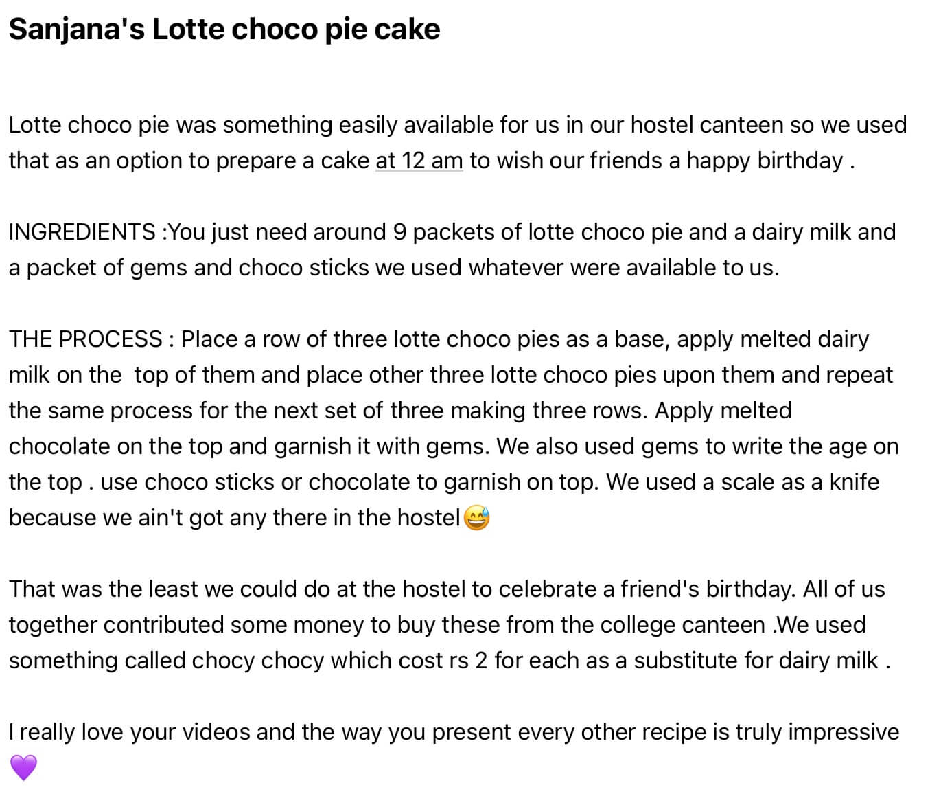 This is so easy and fun to make and it just made me so happy looking at it. If I was living in a hostel and somebody made it for me on my birthday, it would make me feel so good and appreciated! As a chocopie fan, I only have good things to say about this quick dessert.