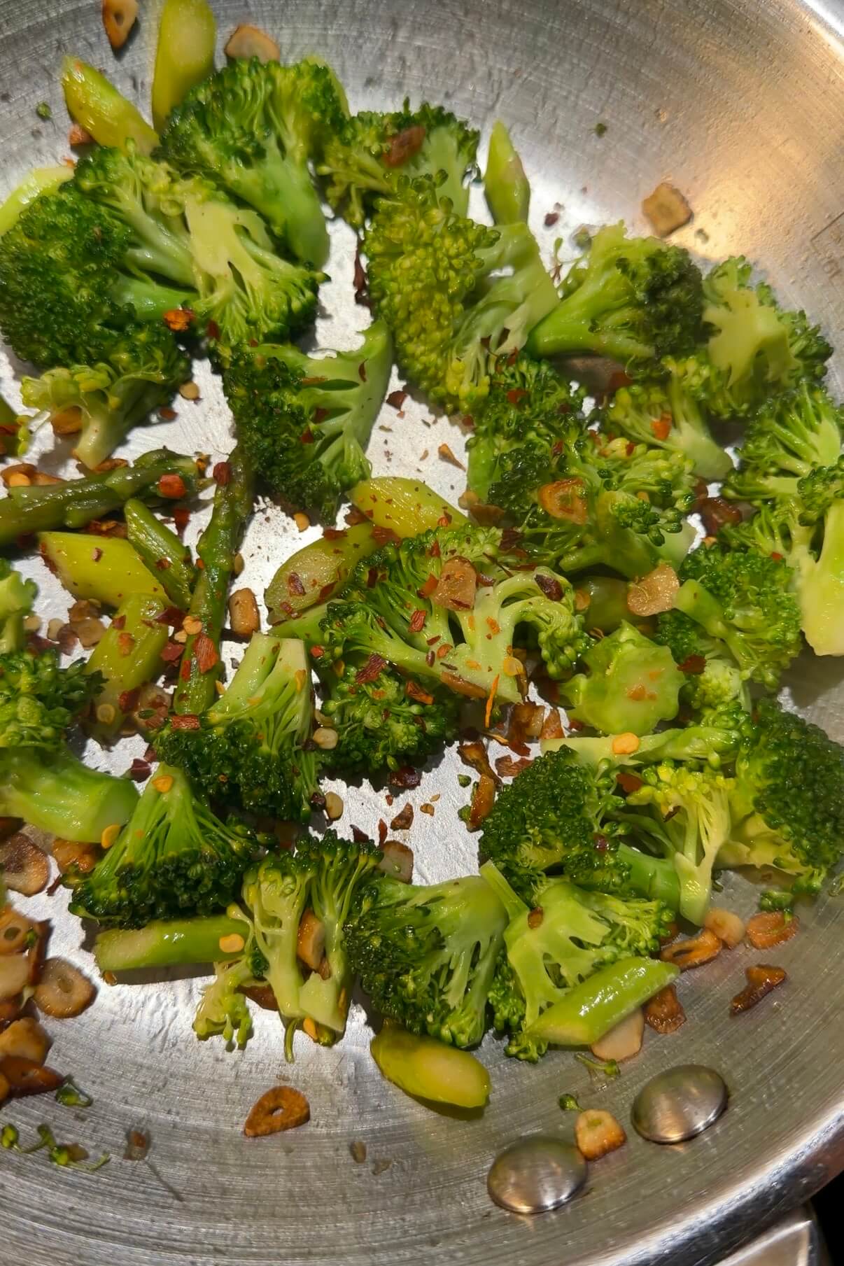 - Add the chopped asparagus and broccoli. Mix well and cook until both turn bright green and are just tender.