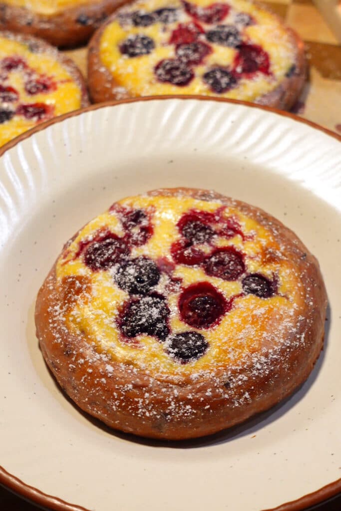 The filling is made with cream cheese, condensed milk, cream and custard powder which bakes into a smooth, creamy centre. Topping the buns with extra berries before baking gives you little jammy bursts that make every bite more interesting and the result is a bun that’s soft and fluffy with a slight chew, a creamy middle and fruity bits on top making it almost like a cheesecake tucked inside a soft bread!