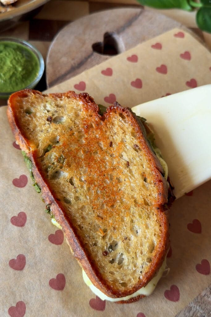 6. Slice, serve with extra pesto and enjoy your cosy café style sandwich!