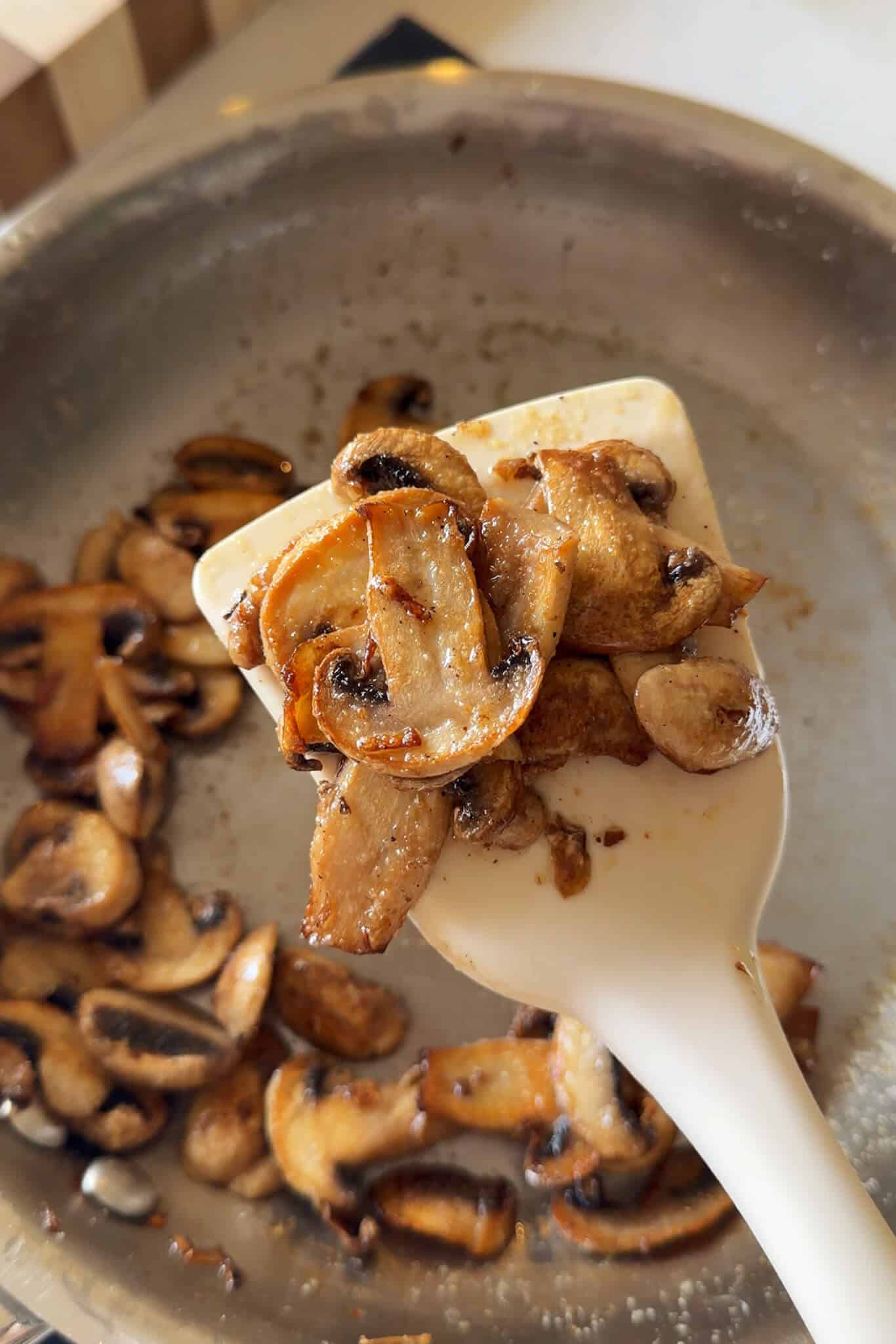1. Slice your mushrooms and add them to a pan in a single layer. Cook on medium high heat till they release their water.