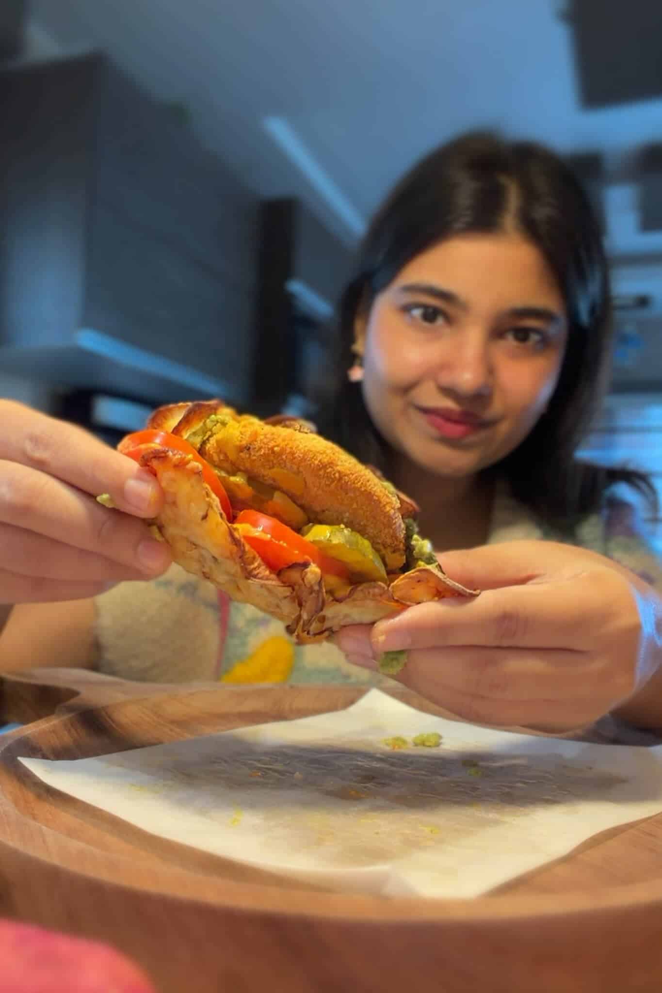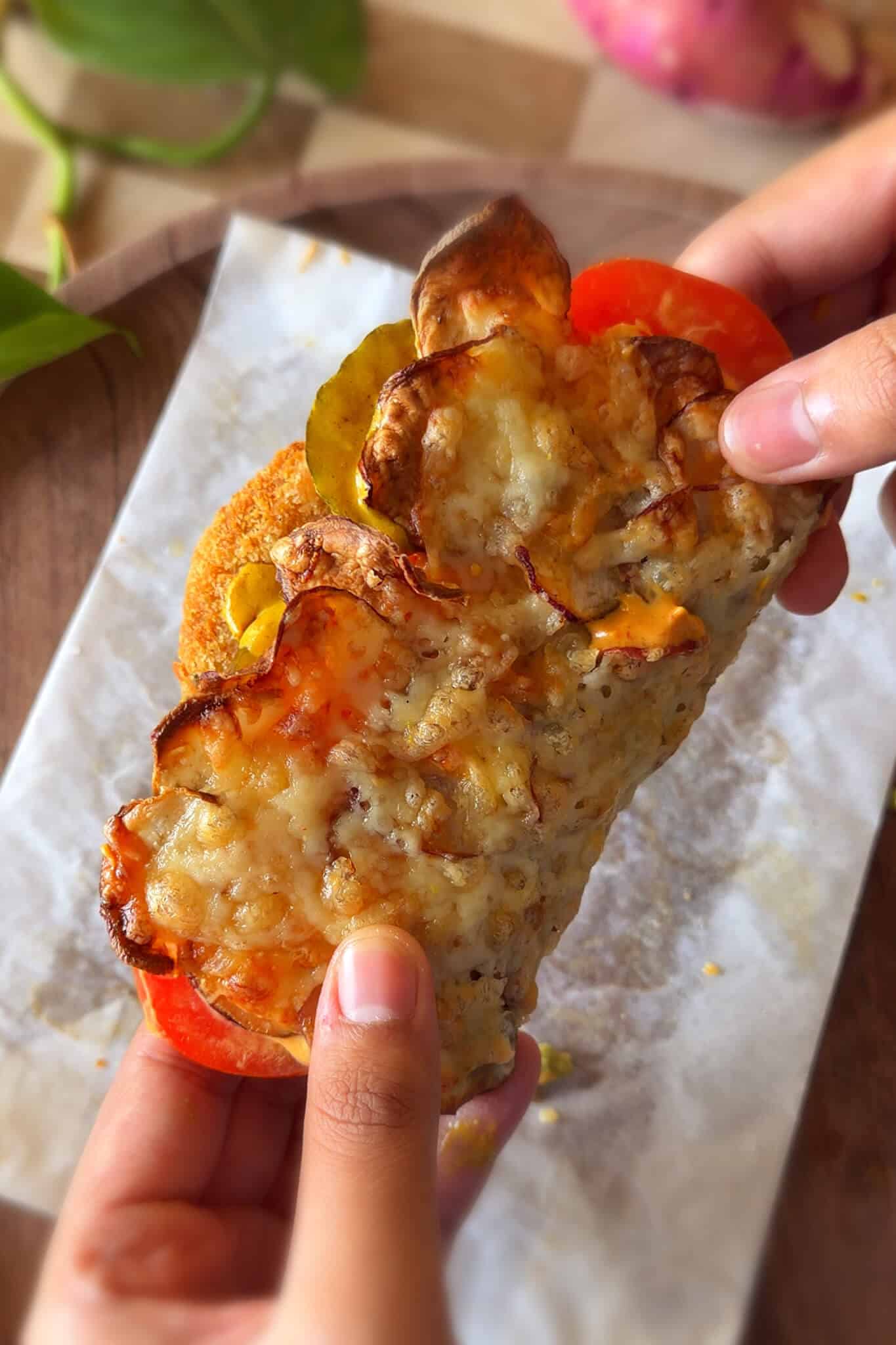 - Assemble the filling. I went for a burger style wrap. Spread mashed avocado on one half and tandoori mayo on the other. Place an airfried vegetable patty on the avocado side. Add sliced onion and tomato on the mayo side and then top the patty with sliced gherkins or pickles and mustard sauce.