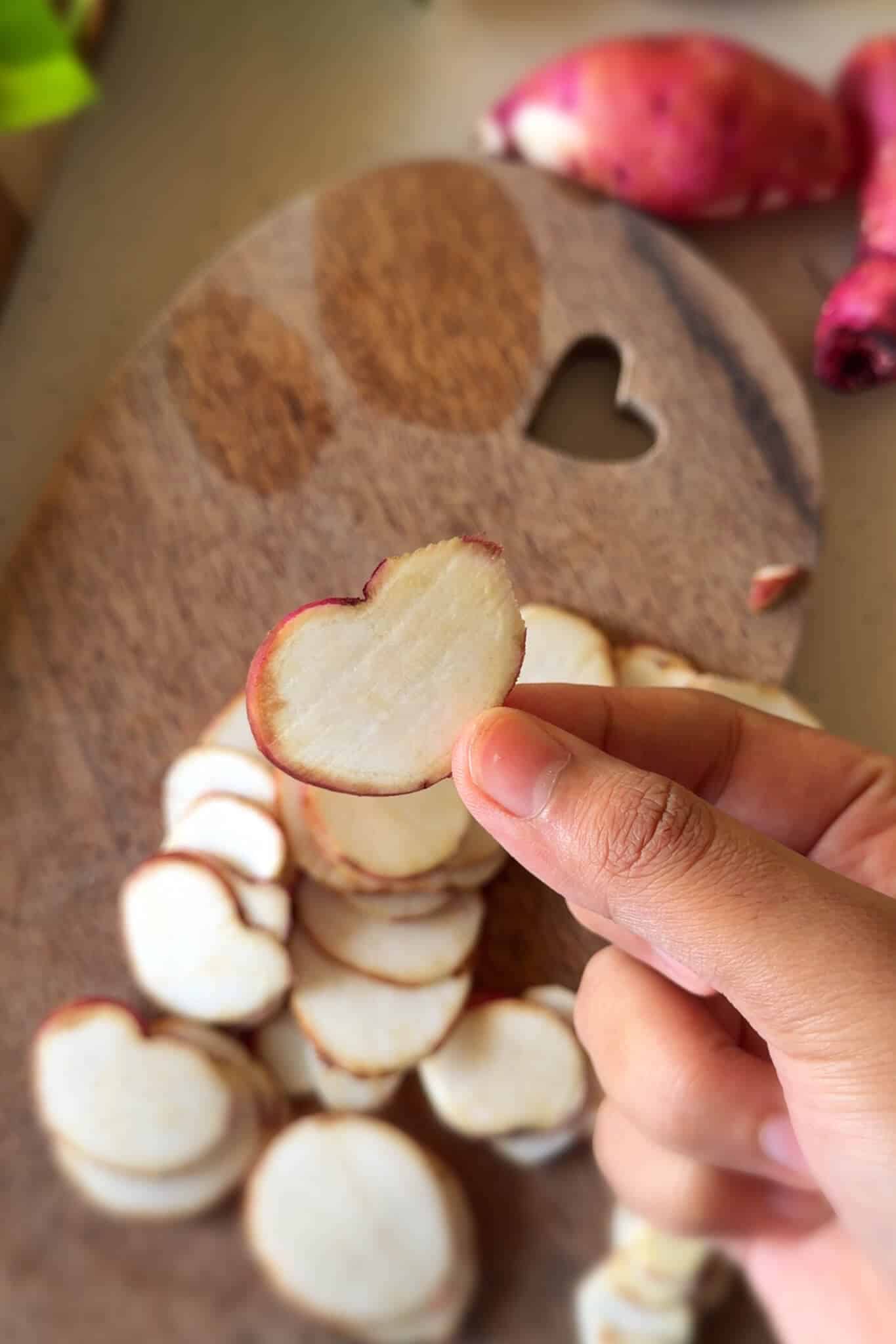 - We start with the sweet potatoes. Peel only the parts that don’t look great and then wash them really well. Slice them super thin using a mandolin or a sharp knife.