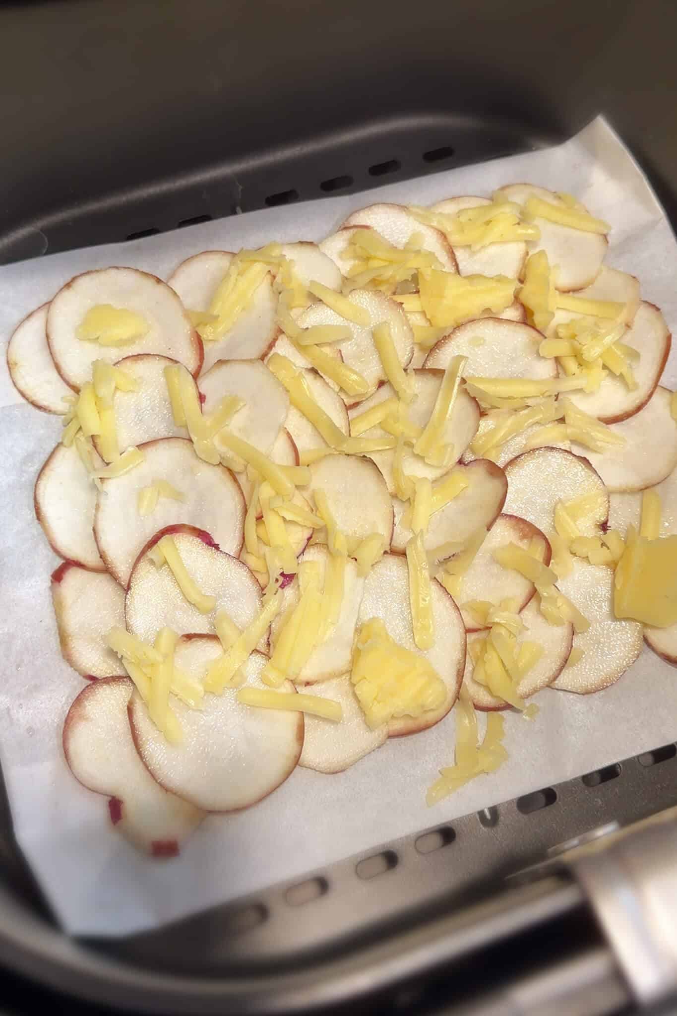 - Line your air fryer basket or baking tray with parchment paper. Arrange the sweet potato slices slightly overlapping, like a ratatouille-style pattern, forming a neat rectangle or square. Make sure there are no big gaps.