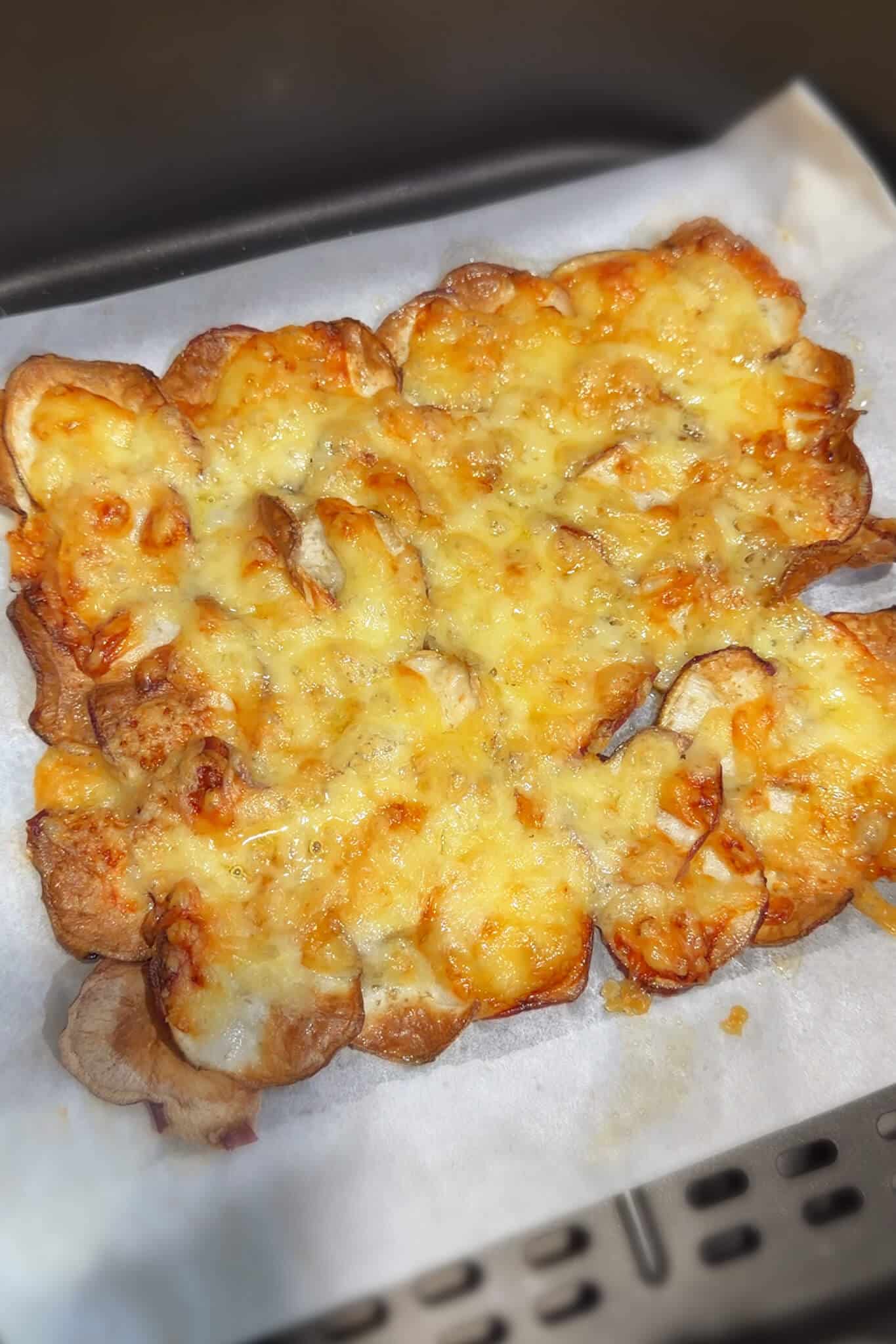 - Airfry at 180°C for 13–15 minutes or bake at 180°C for 20-25 minutes until the bottom turns crisp and the cheese melts. I like to add cheese in two stages. Airfry once, then at around the 7 minute mark, take it out, add a little more cheese on top and put it back in. This gives you a crisp cheesy base with extra melty cheese on top.