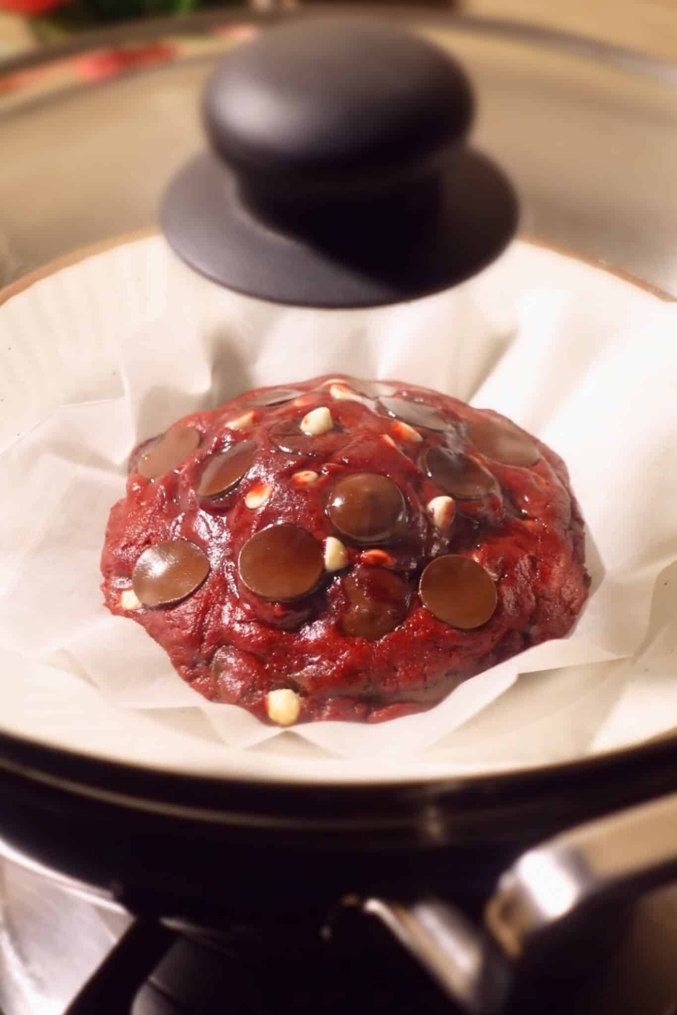 If you’re not very good with self control, this recipe might be kind of dangerous for you. Why? Cause it is SO easy to make, you’ll want to make it every single day! This is my single serve red velvet cookie (or kookie as I like to call it) made with no eggs, no chilling required and ready in just a few minutes with on a stove with no need for an oven, airfryer or microwave!
