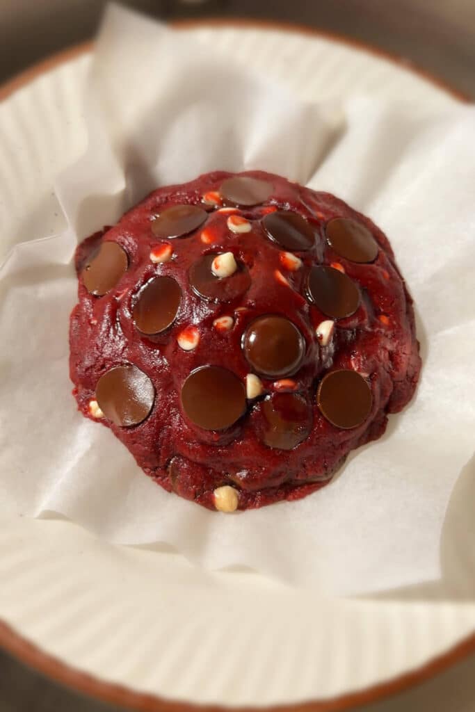 - Optionally stuff the cookie dough with frozen cream cheese (frozen for atleast 30 minutes), place onto a parchment paper and top with more chocolate.
