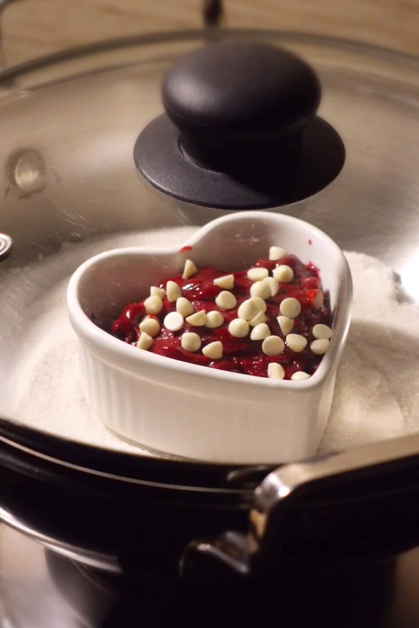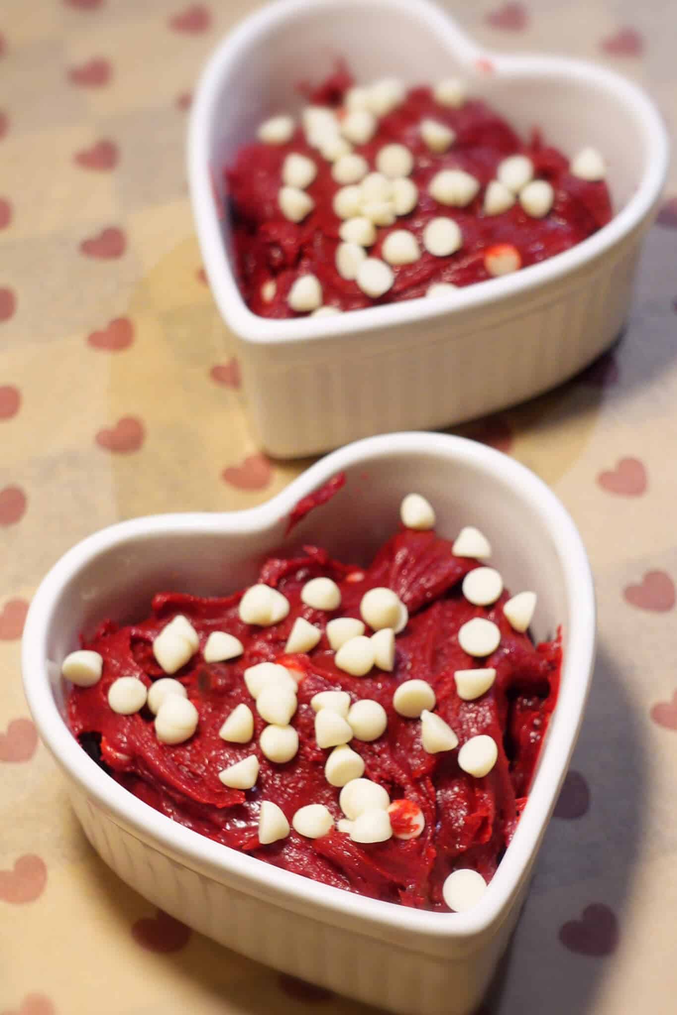 - Add equal amounts of cookie dough into 2 ramekins, place frozen cream cheese in the centre and cover with the remaining cookie dough.